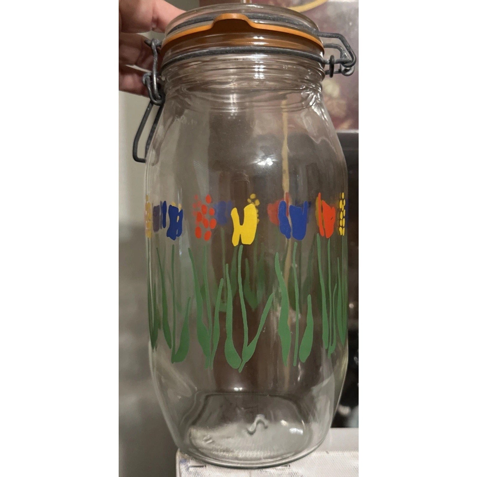 The ARC France Glass 2 L Canister with Floral Design is a stylish and vintage kitchen storage item made in France. This clear cylindrical canister features a beautiful floral pattern on its attached lid, adding a touch of retro charm to any kitchen decor. With a size of 2 liters, standing at 10" tall and 4 1/2" at its widest point, this canister is both functional and decorative for organizing your kitchen essentials in a unique and elegant way.