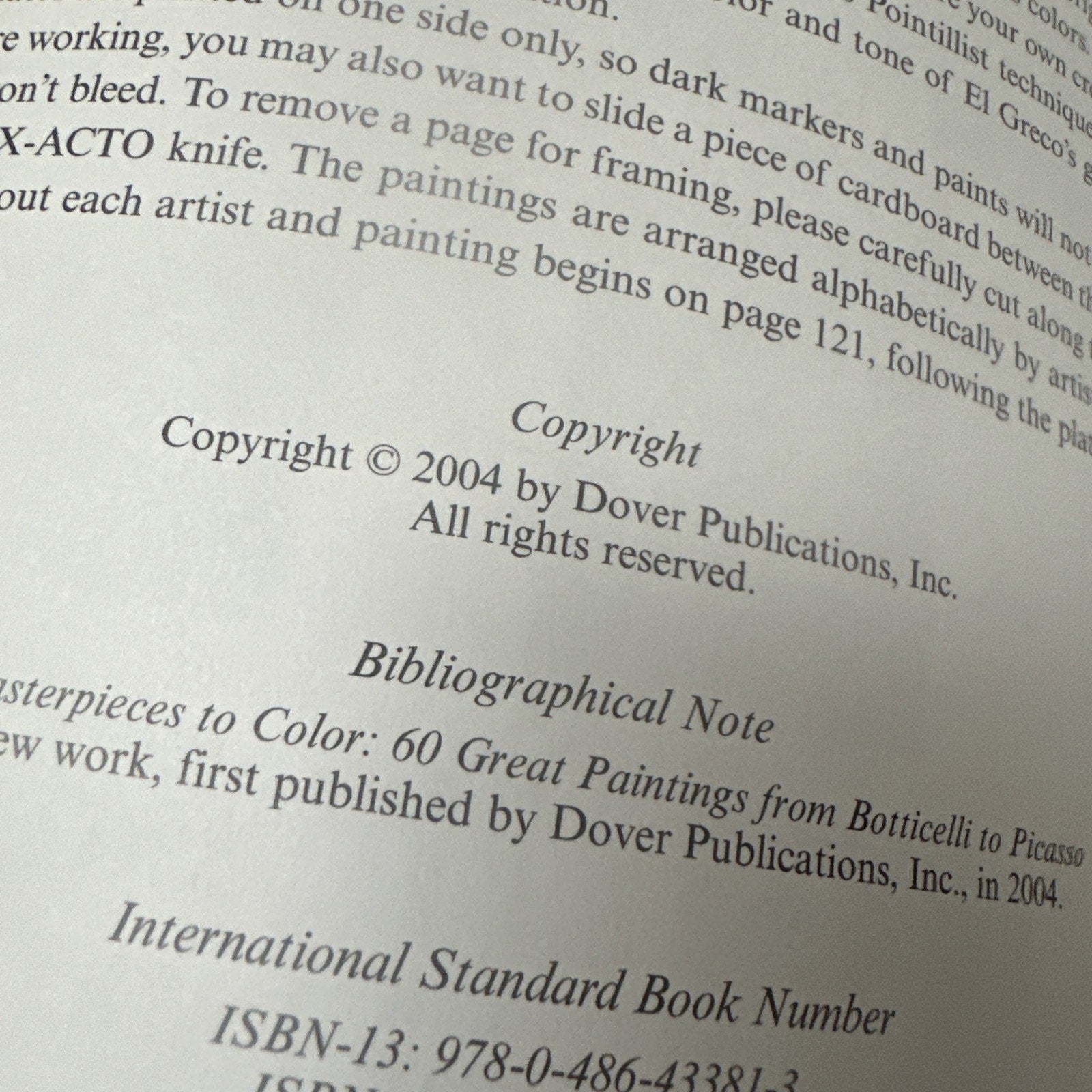 Discover the beauty of art with "Art Masterpieces to Colour: 60 Great Paintings from Botticelli to Piccasso," a comprehensive Dover Children's publication designed to introduce colours and techniques through the lens of history's most celebrated artists. With 128 pages of Botticelli's Botticelli to Picasso's Picasso, young readers aged 11 to 14 years can explore and learn about the fundamentals of art while engaging in creative expression.