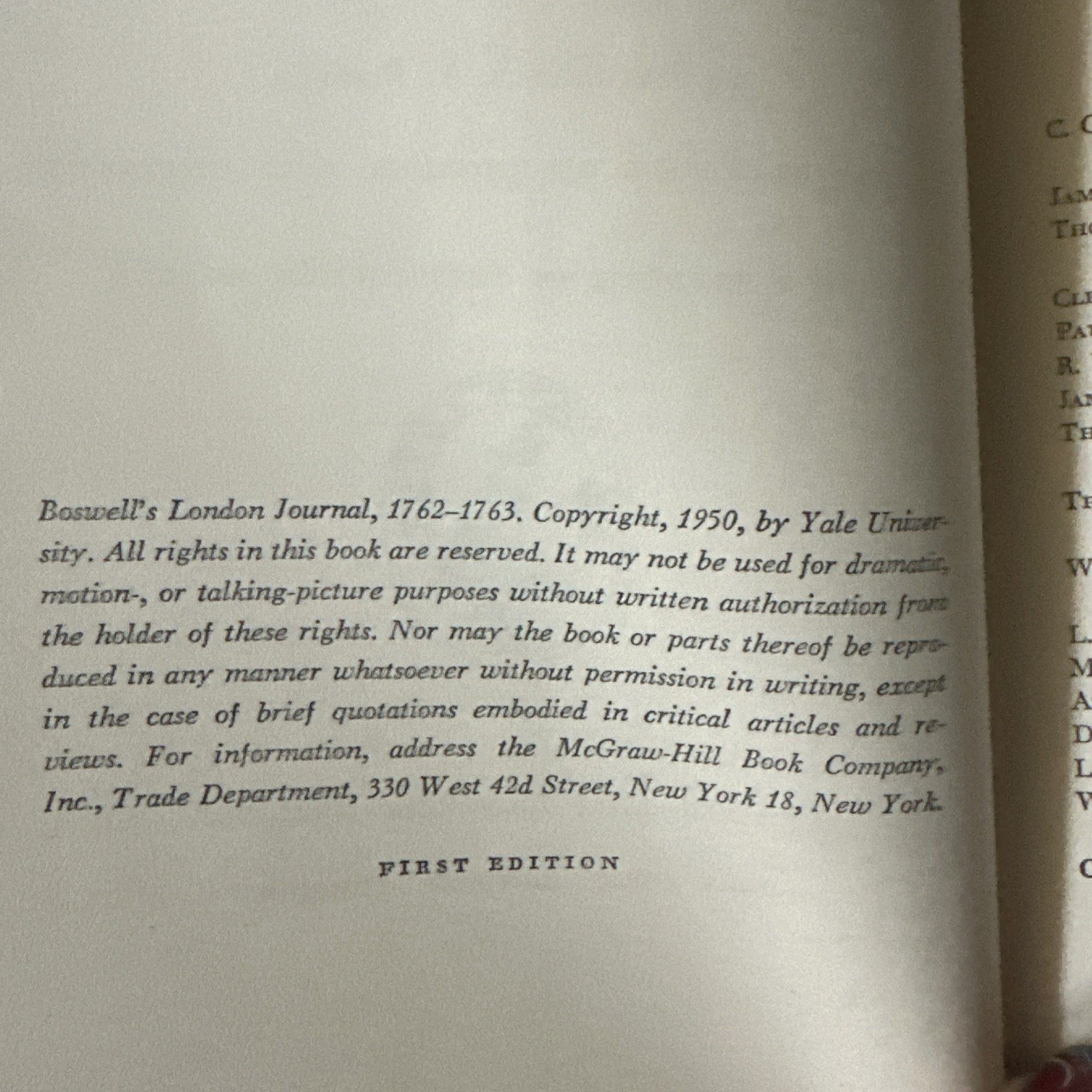 Boswells LONDON JOURNAL 1762-1763 Hardcover 1950 Rare 1st Edition