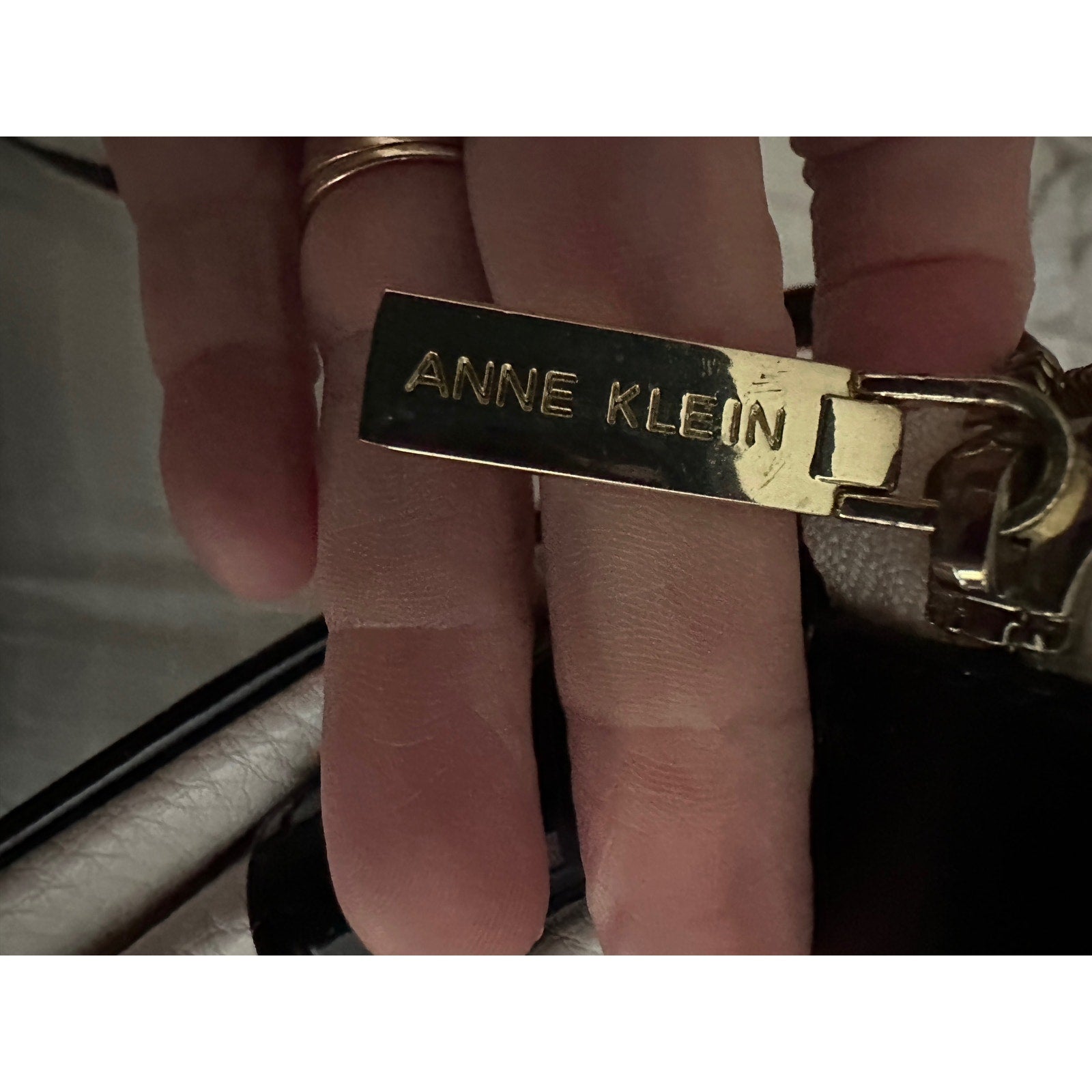 Black and white, man-made material, cross-body, patent-leather purse. Anne Klein, never been worn, in excellent condition, bearing iconic lion face image in gold accent. Black and white polk-a-dot polyester like interior. Measures 11 inches X 7.5 inches, 48 inch adjustable strap. Very nice, classical and fashionable. Please enjoy.