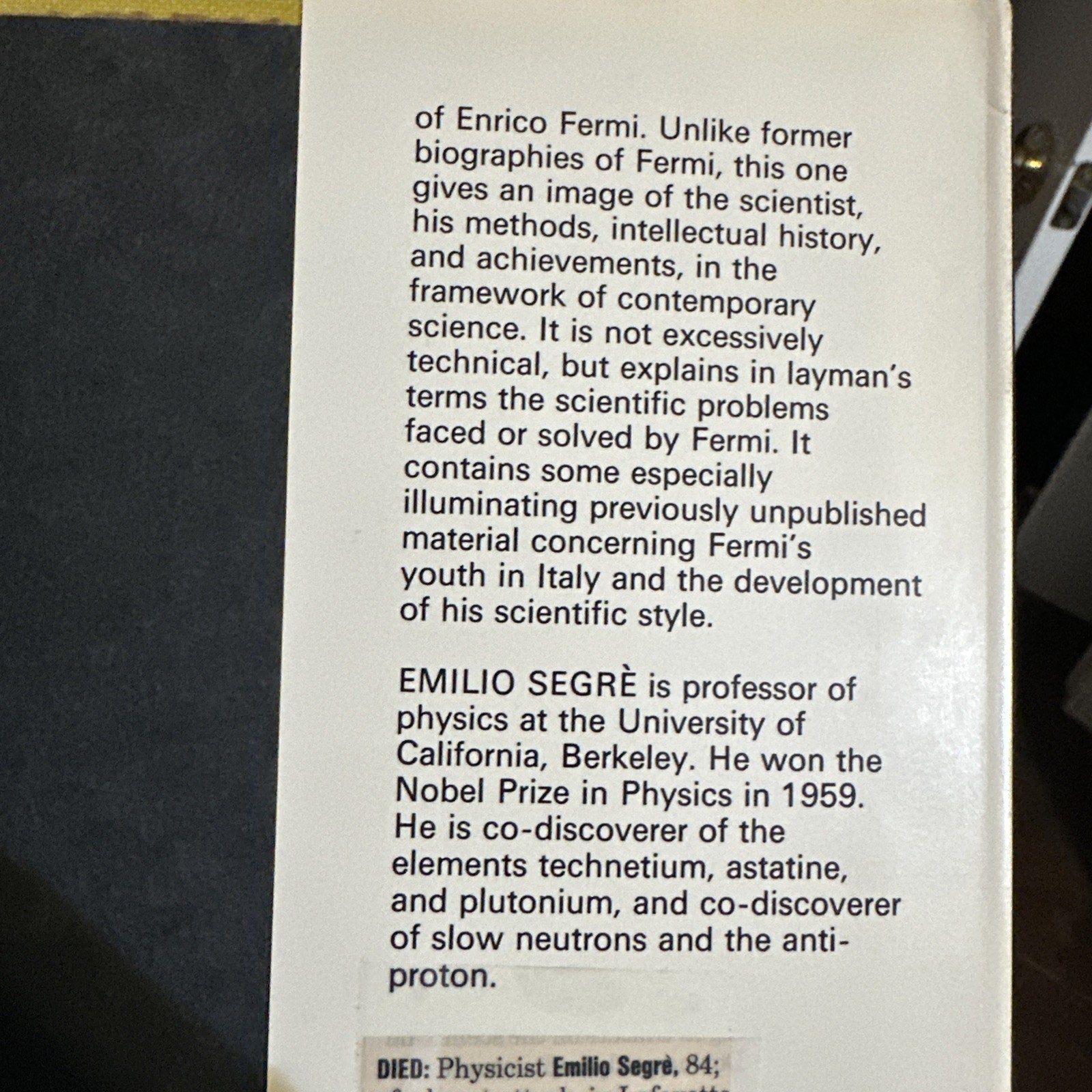 This hardcover book titled "Enrico Fermi Physicist" written by Emilio Segrè is a valuable addition to any book collection. The book provides insightful information about Fermi's life and his contributions to the field of physics. The pages are in excellent condition and the binding is sturdy, making it a great read for anyone interested in Fermi's work.
