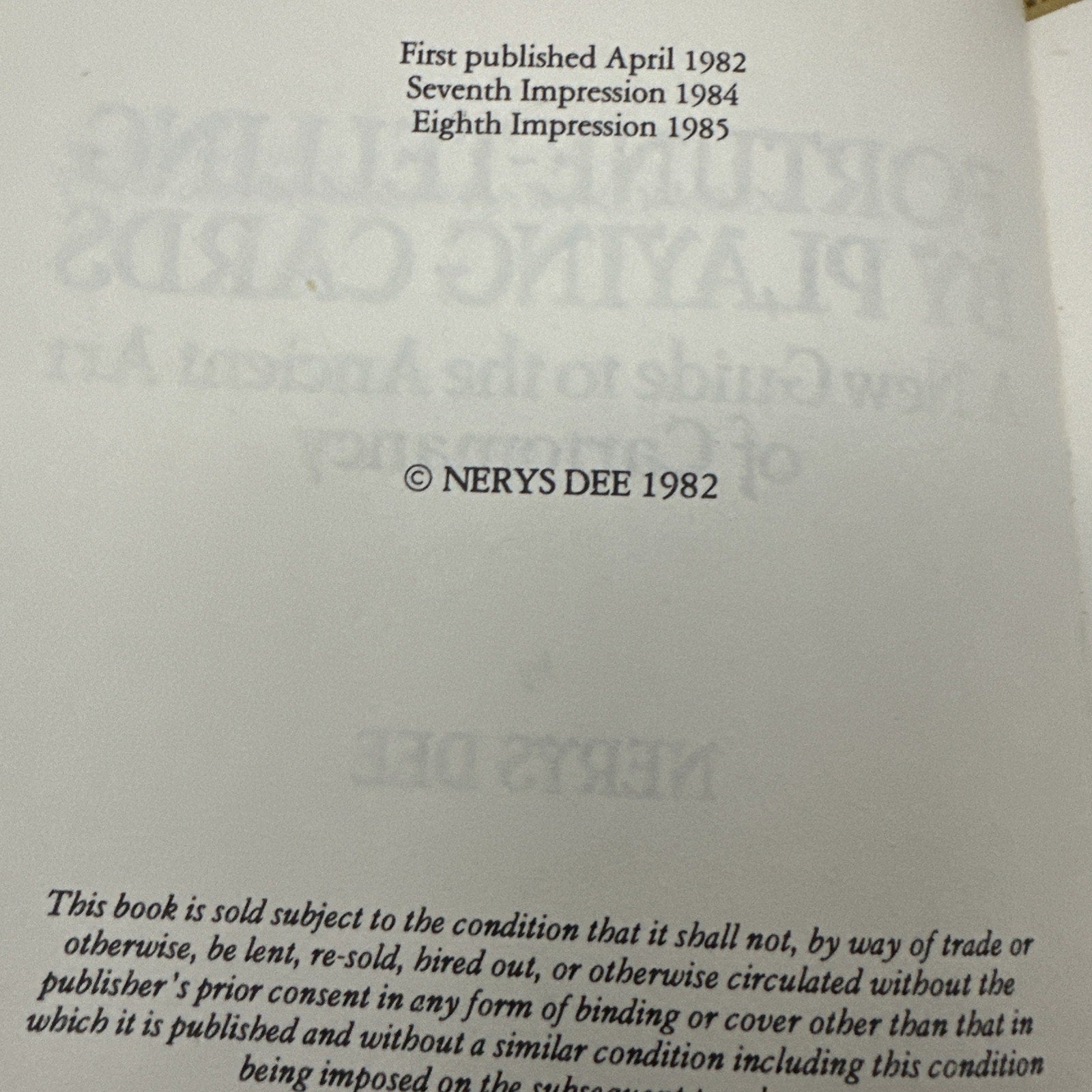 "Fortune-Telling by Playing Cards: A New Guide to the Ancient Art" is a vintage hardcover book published in 1982 by The Aquarian Press Ltd. Authored by Nery's Dee, it serves as a guide to the practice of cartomancy using playing cards. With 159 pages, this illustrated book is intended for young adults and adults interested in the art of fortune-telling, providing insights into interpreting playing cards for divination purposes.