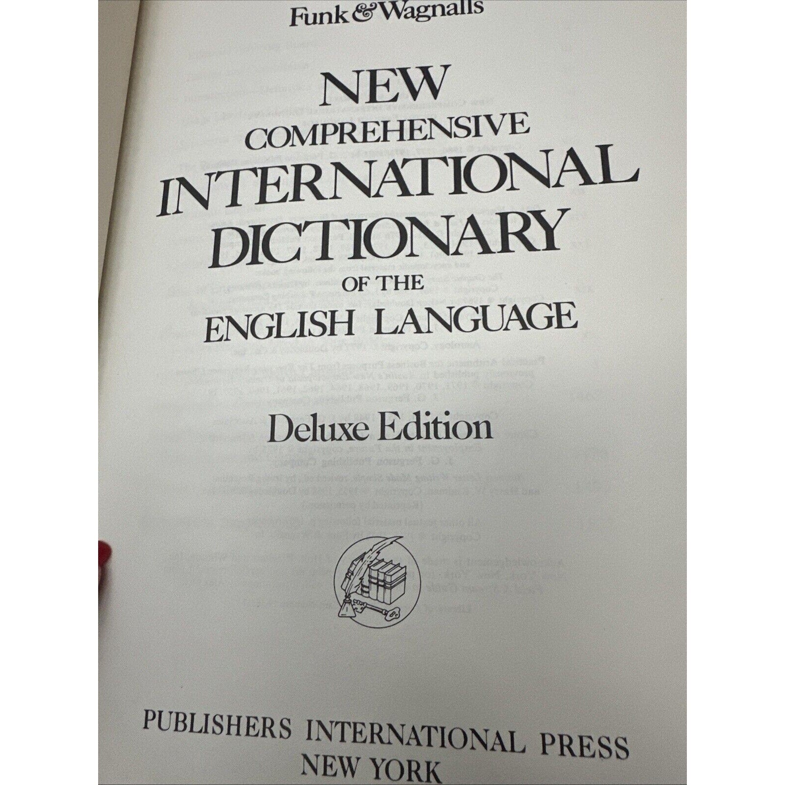 The product is the "Funk And Wagnalls New Comprehensive Dictionary Of The English Language 1978 Ed." This deluxe edition dictionary by Funk & Wagnalls is a hardcover book written in English. It is a comprehensive reference featuring dictionaries and thesauri, making it a valuable resource for language enthusiasts and collectors alike. The publisher is also Funk & Wagnalls, known for their high-quality publications in the field of language and reference materials.