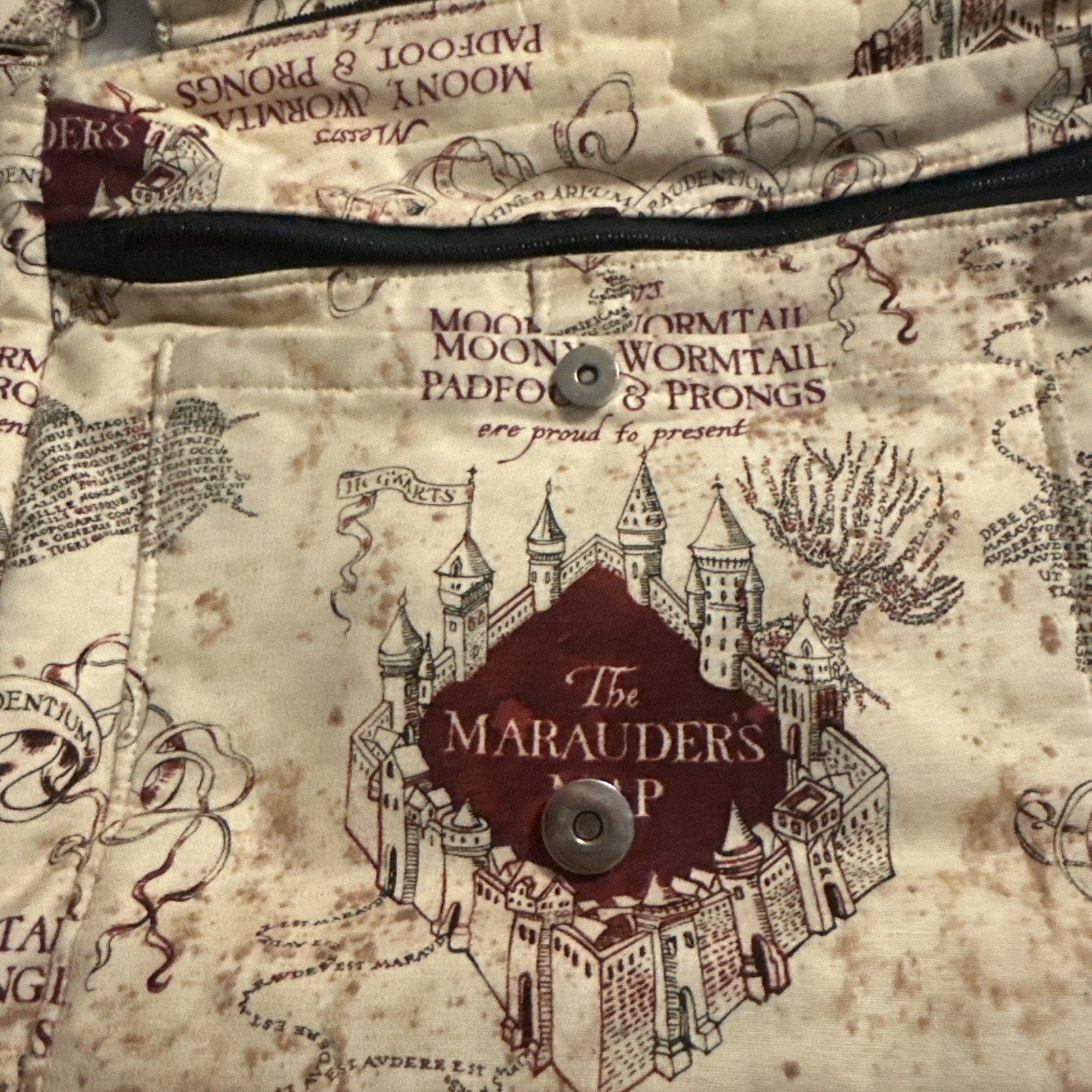 The Harry Potter Marauders Map Crossbody Purse is a rare and unique accessory for fans of the Harry Potter series. With a medium size and adjustable strap, this purse is perfect for on-the-go use. The exterior features a design inspired by the Marauders Map, showcasing iconic Harry Potter characters and elements. The purse also includes a coin purse for added convenience. Made by Lara Howl Designs this purse is a stylish and functional addition to any Harry Potter enthusiast's collection.