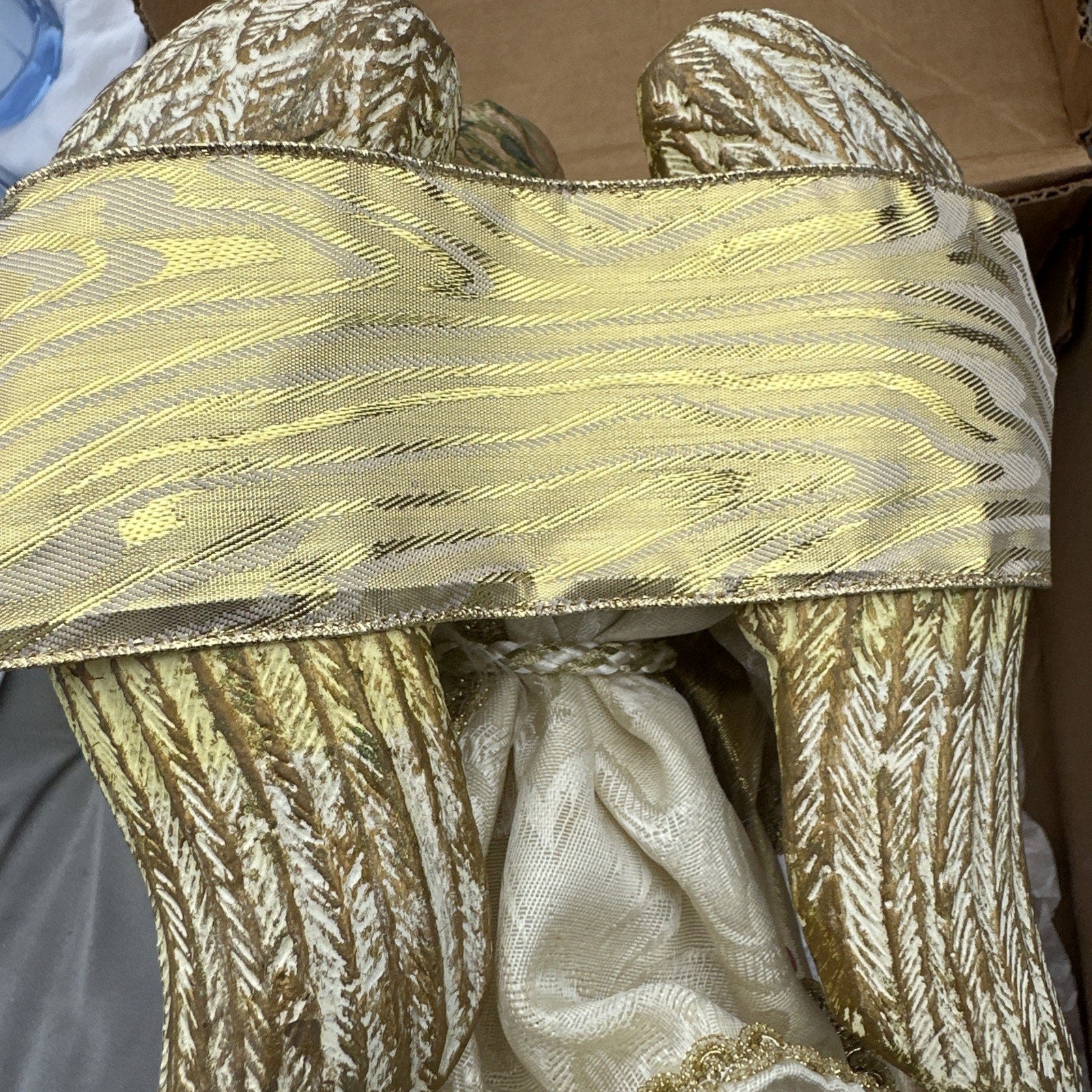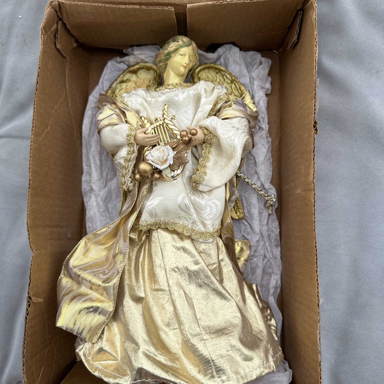 Ivory and Gold Angel Lighted Christmas Tree Topper Holding Harp. Condition is Used. Shipped with USPS Ground Advantage.
