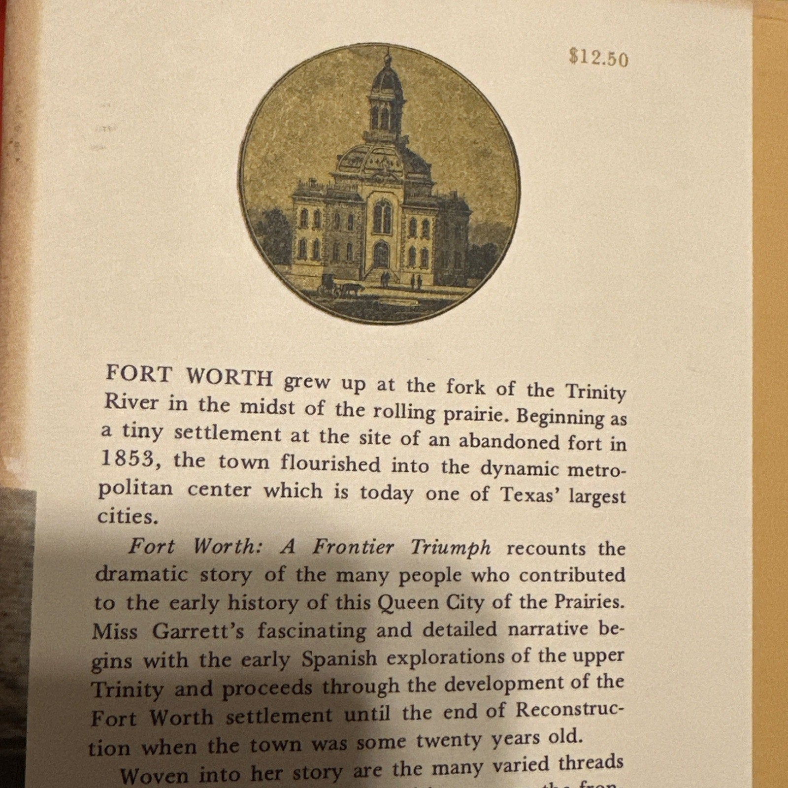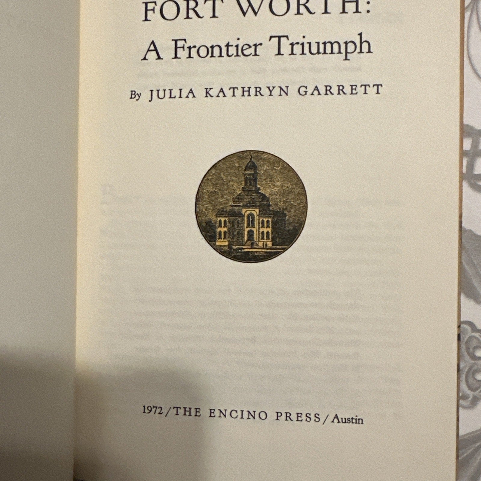 The product is a first edition hardcover book titled "Fort Worth: A Frontier Triumph" by Julia Kathryn Garrett, published in 1972 by The Encino Press. The book is in English and focuses on the subject of history, specifically the frontier triumph of Fort Worth. It includes special attributes such as a dust jacket, making it a valuable collectible for those interested in antiquarian books and Texas history. This original edition provides a unique insight into the history of Fort Worth and its frontier development.