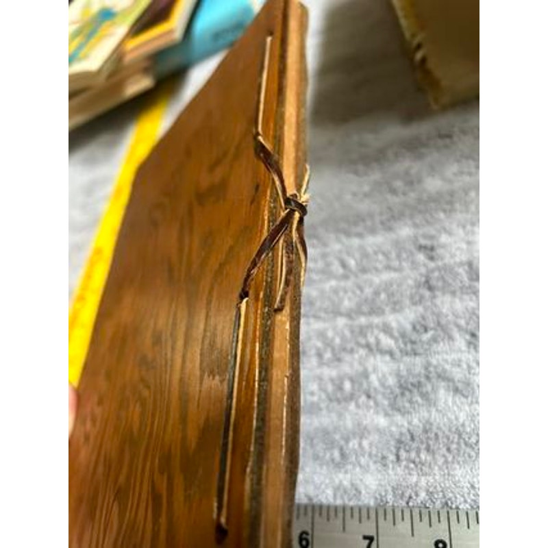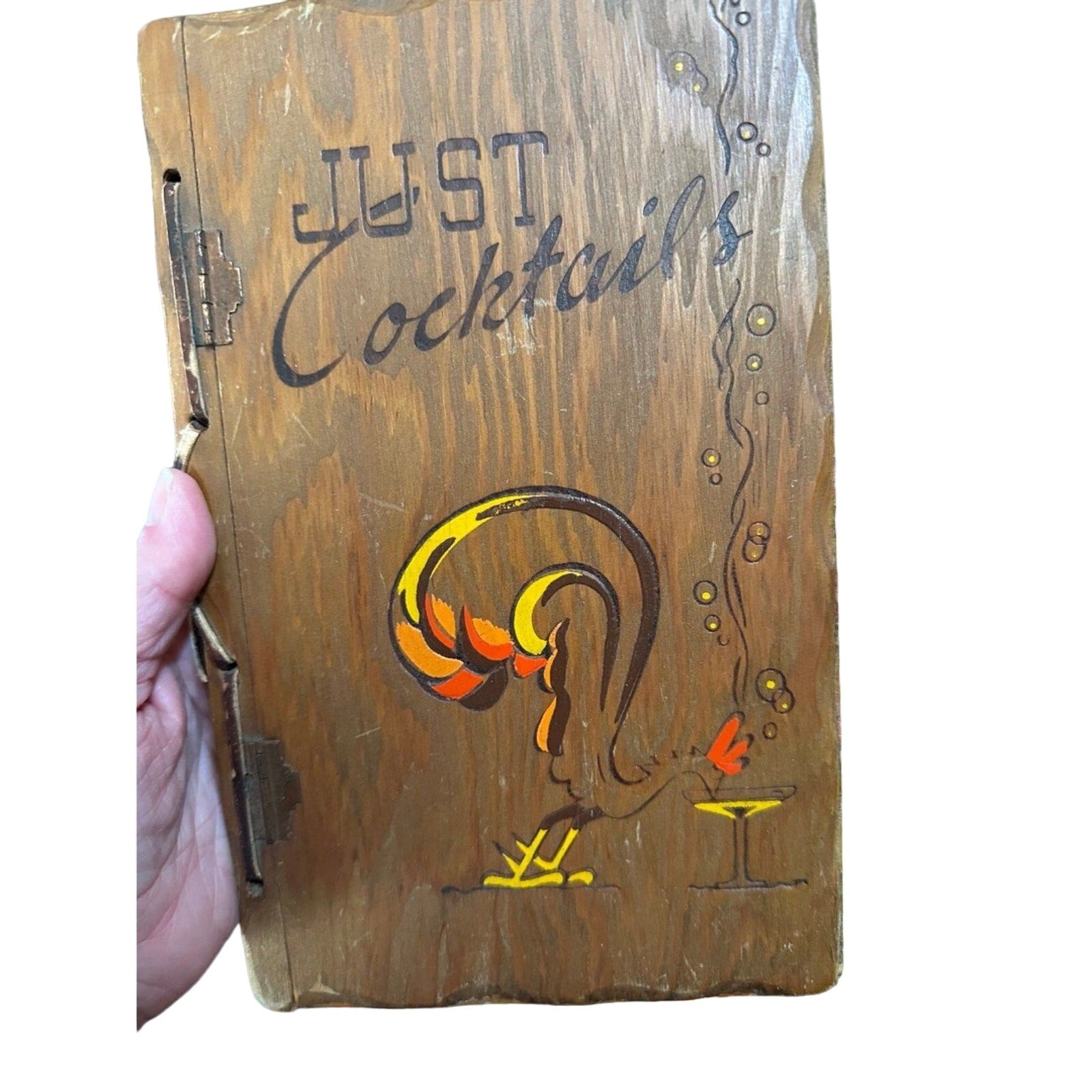 Just Cocktails bar recipe book with wood covers and leather tie binding. Copyright 1939 by W.C. Whitfield. pages are in excellent condition with minimal yellowing. No torn pages. No water damage. Size is approx. 6 x 9.5 x .50.