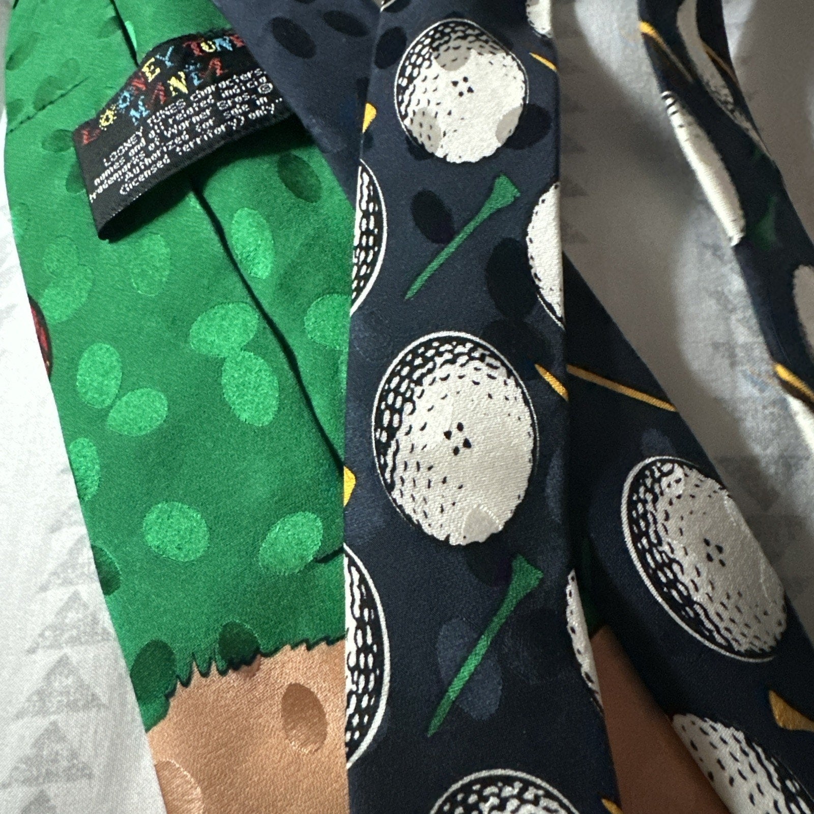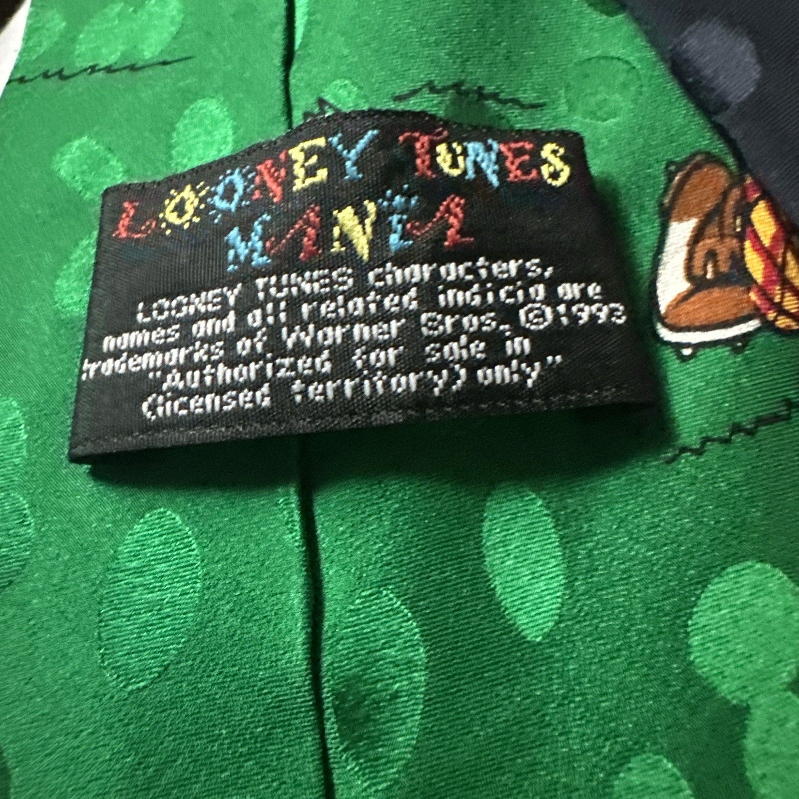 Add some fun to your wardrobe with this Looney Tunes Mania Bugs Bunny neck tie. The tie features a novelty pattern with Bugs Bunny and golf-themed accents, making it a great accessory for golf enthusiasts. Made from 100% silk and woven fabric, this classic-length tie is perfect for any occasion. The tie is tied and has a logo accent, making it a stylish addition to your outfit. This vintage tie is one size and has a width of 3 1/2 inches to 3 3/4 inches, making it a perfect fit for most men. The tie is in great condition and is a perfect addition to any Looney Tunes fan's collection.