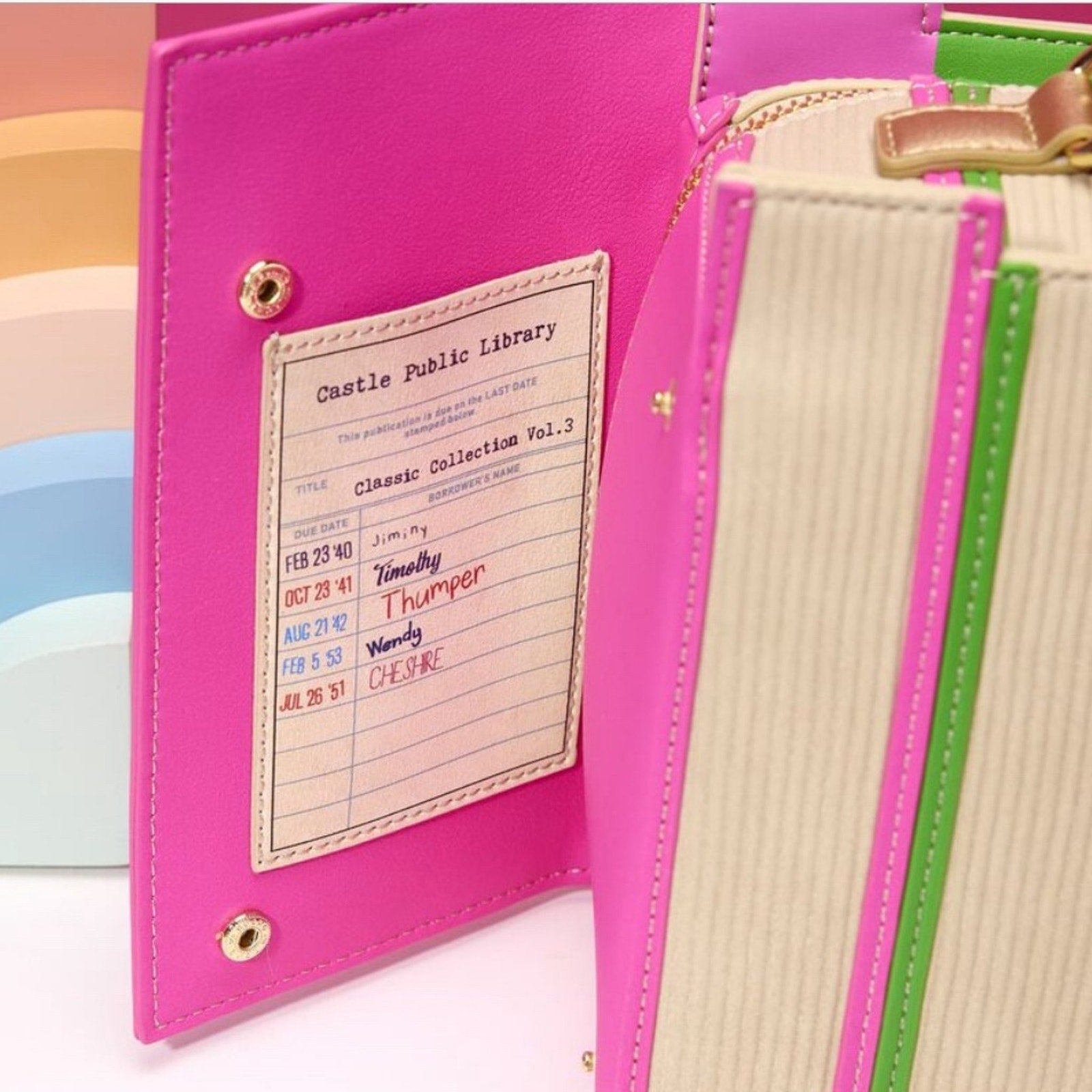 Each bag also comes with a matching enamel pin of Disney Classics books, which is approximately 1.5 inches tall, with shiny gold hardware and the classic Loungefly/Funko crown debossing on the back. This pin is only available with this Stitch Shoppe by Loungefly collection!