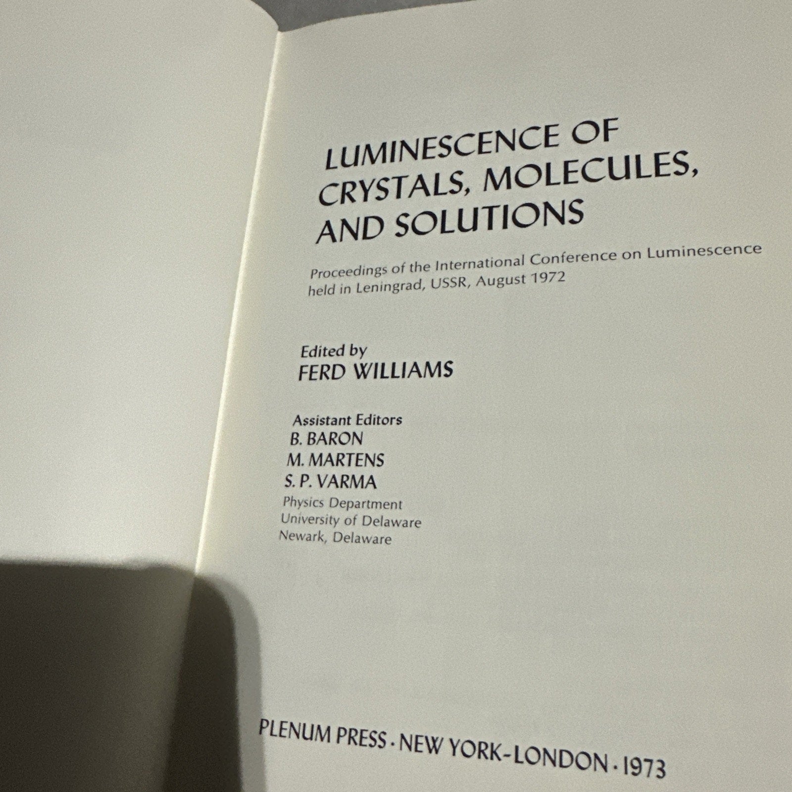 Luminescence of Crystals, Molecules, and Solutions 1973 Fred Williams Pre- Owned