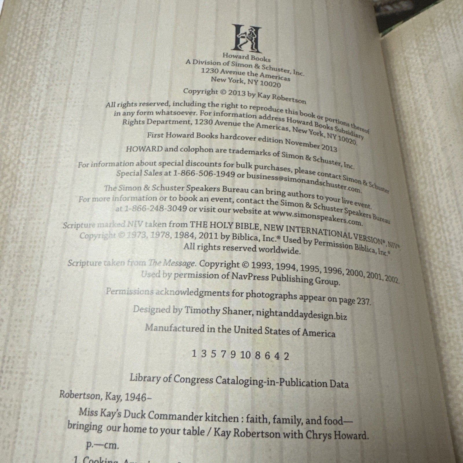 "Miss Kay's Duck Commander Kitchen: Faith, Family, and Food--Bringing Our Home to Your Table" by Kay Robertson is a trade paperback book published by Howard Books in 2013. The book, with 256 pages, features recipes and stories from the famous Duck Commander family, known for their commitment to faith, family, and food. The book includes illustrations and showcases the regional and ethnic flavors of American Southern cuisine, making it a valuable addition for cooking enthusiasts and fans of the Duck Commander family.