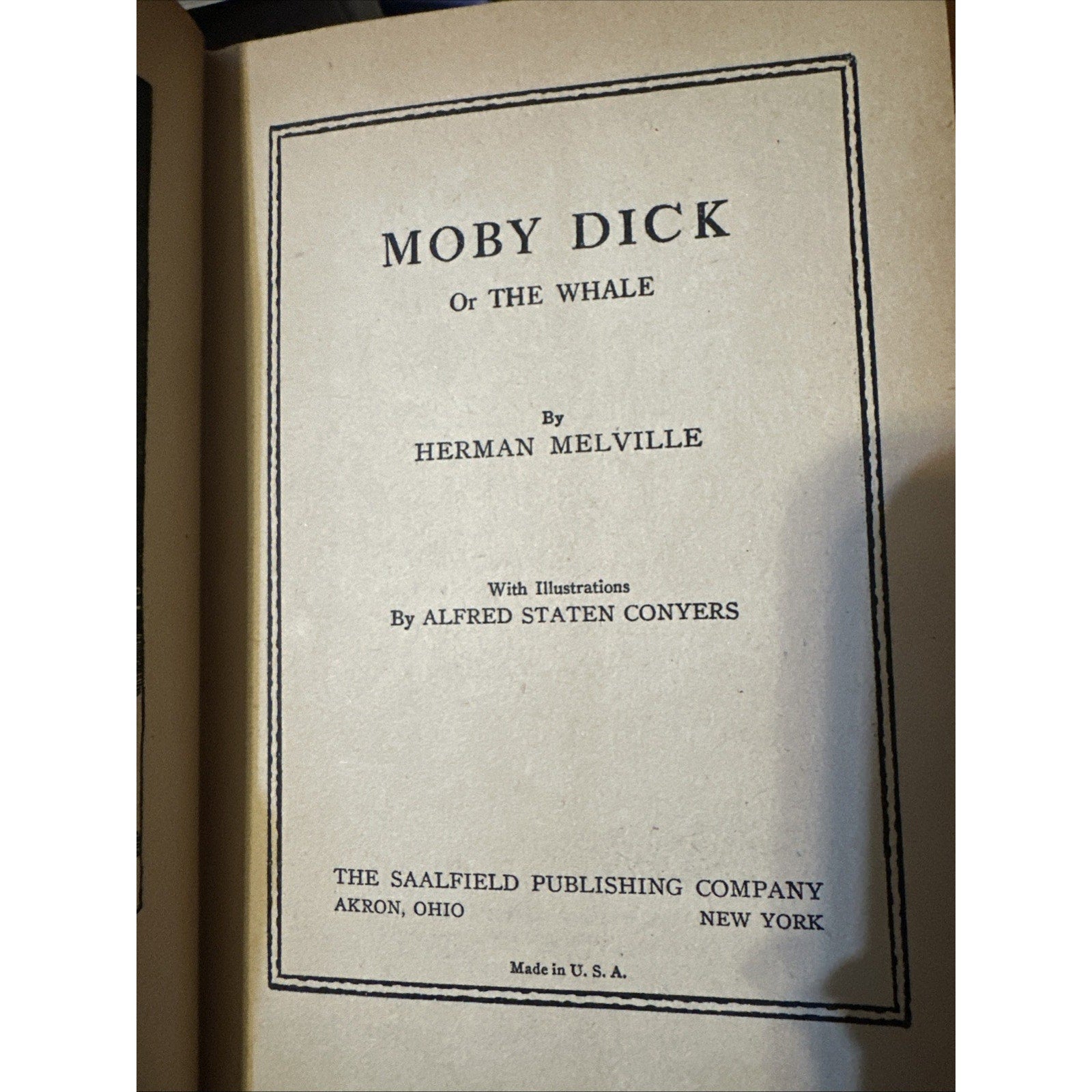 "Moby Dick or The White Whale" by Herman Melville, published by Saalfield in 1931. As a classic piece of literature and fiction, this book is a valuable collector's item for those interested in English language author's works. With its original printing and special attributes, this edition is a rare and sought-after item for book enthusiasts and collectors alike.