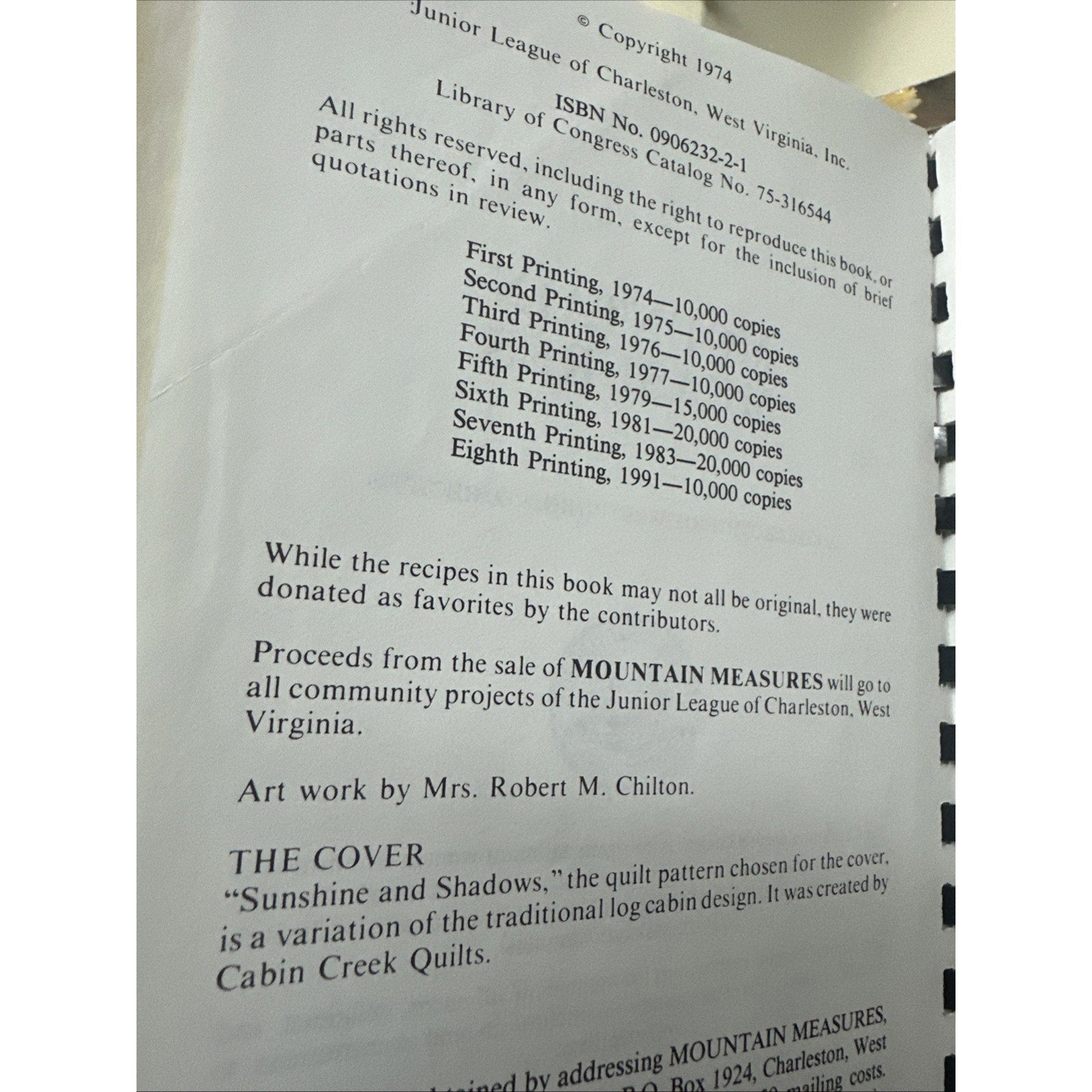 Explore the culinary delights of West Virginia with "Mountain Measures: A Collection of West Virginia Recipes" by the Junior League of Charleston West Virginia. This vintage cookbook, published in 1991, features a spiral-bound format and is revised edition. It is an excellent resource for classic recipes, cooking by ingredient, and regional dishes.