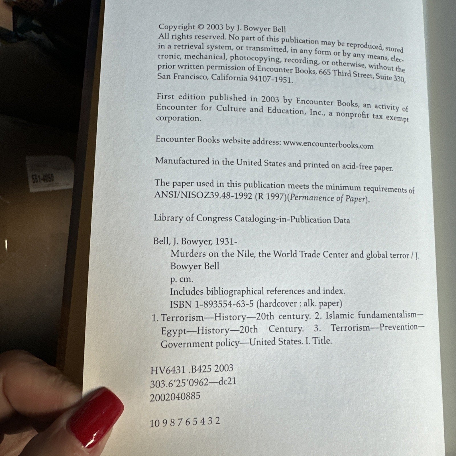 This hardcover book, titled "Murders on the Nile, the World Trade Center and Global Terror," is a must-read for anyone interested in the events of September 11th and the aftermath. Written by J. Bowyer Bell, this book provides a detailed account of the attacks and their impact on the world.