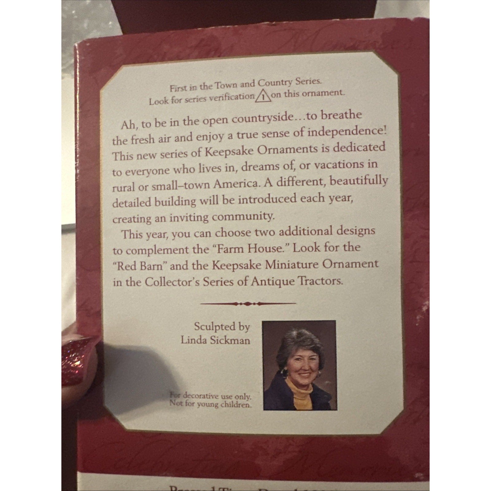 vintage Hallmark Town and Country Christmas ornament from 1999. It features a farmhouse design, making it a charming addition to any holiday decor collection. The ornament captures the nostalgia of Christmas celebrations in a rural setting, perfect for collectors who appreciate classic holiday ornaments with a farm-themed aesthetic.