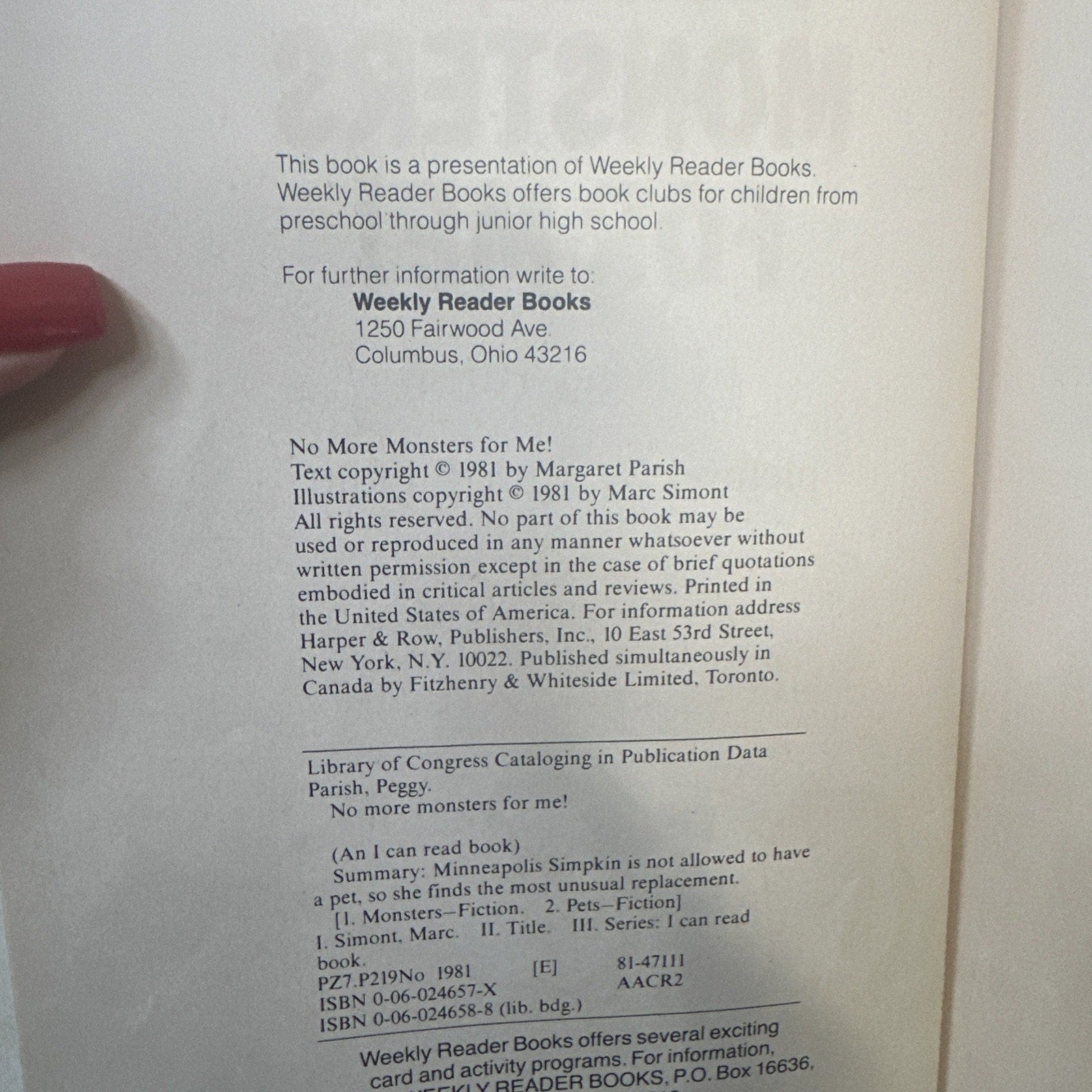 No More Monsters for Me! by Peggy Parish, 1981 Weekly Reader Hardcover Book
