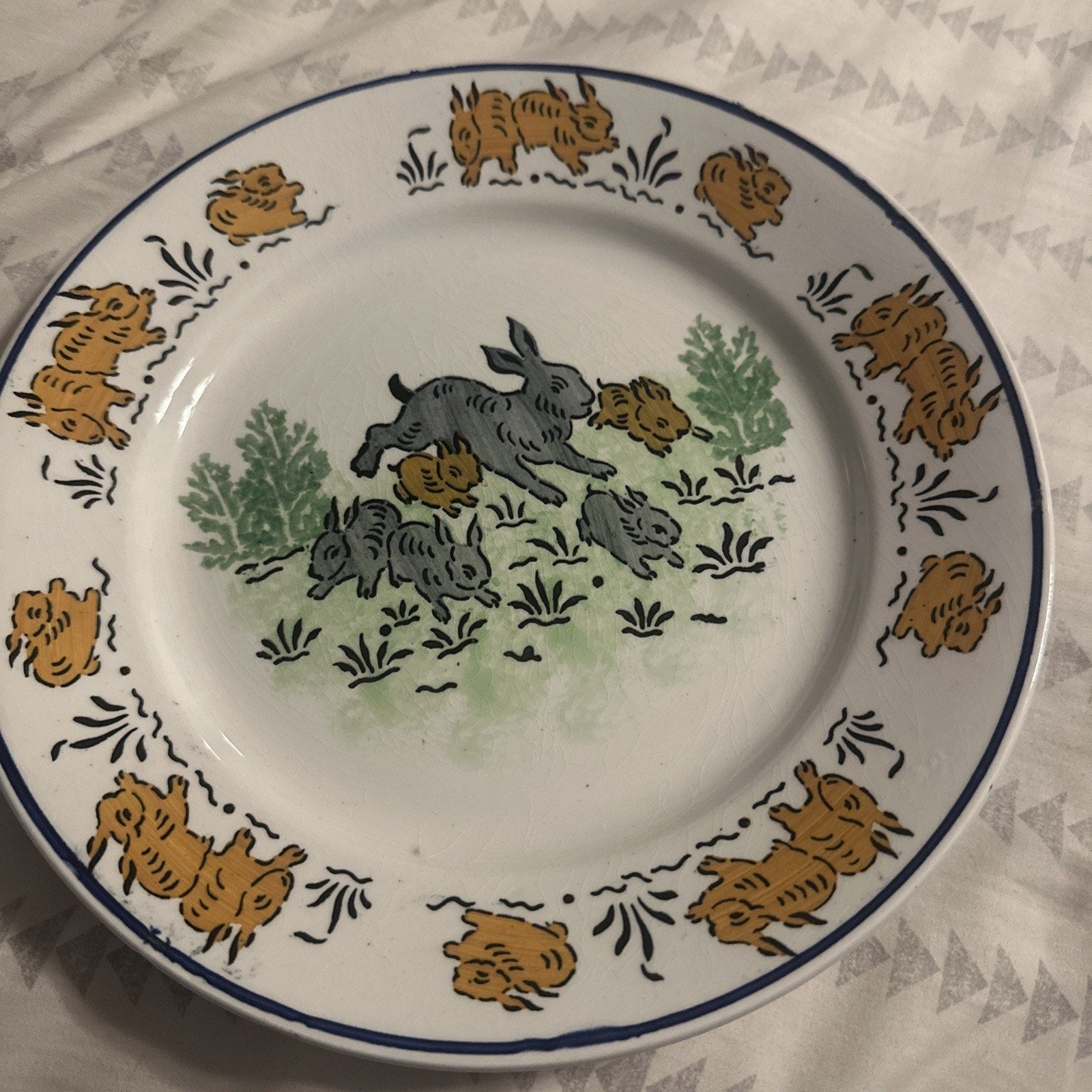 OPAQUE LUNEVILLE FRANCE Hand Painted Plate 9.25 In Vtg Bunny / Rabbit