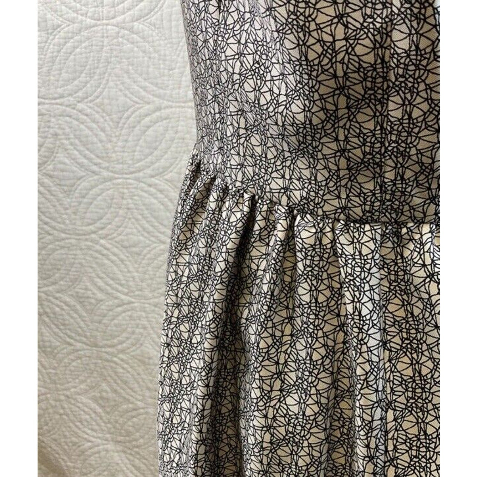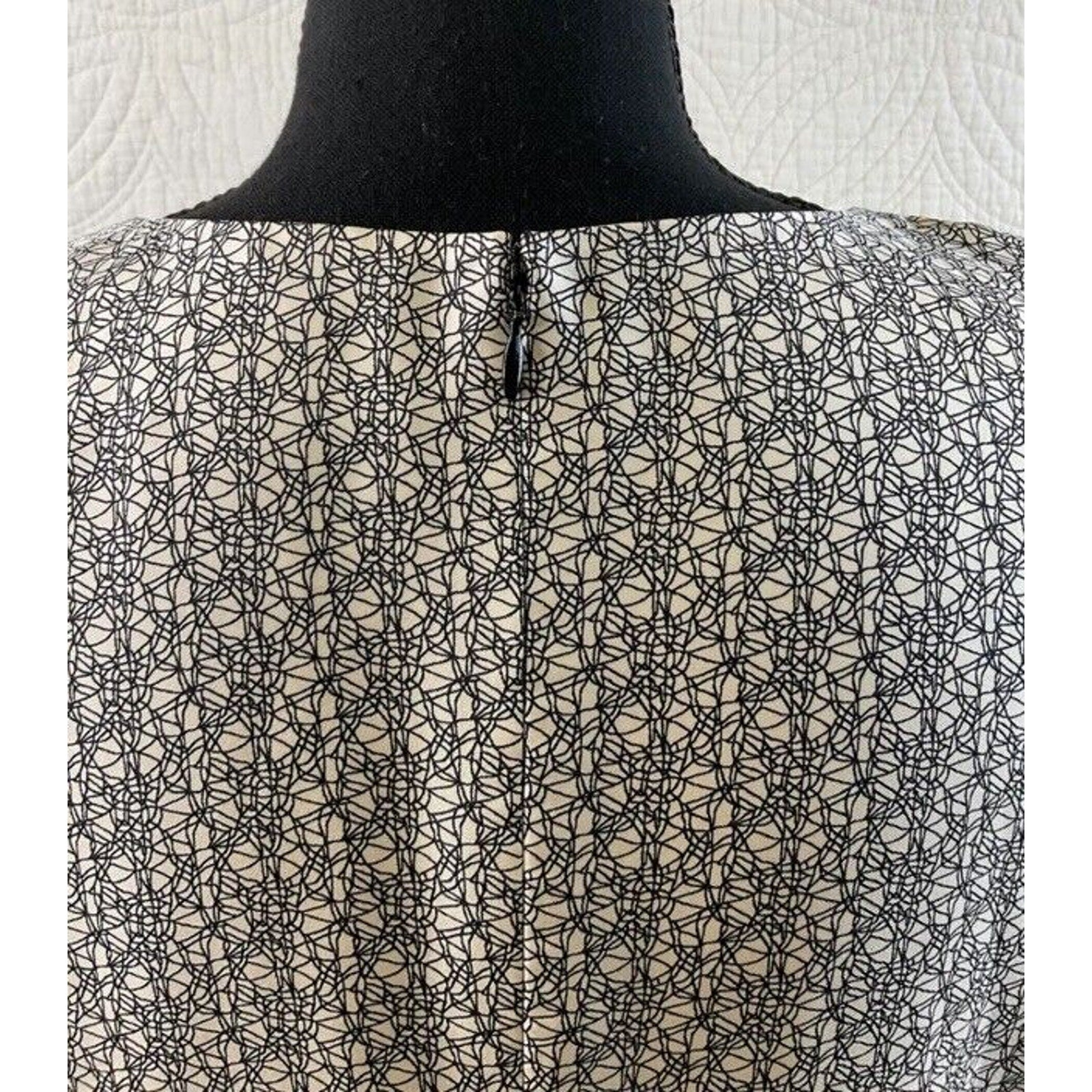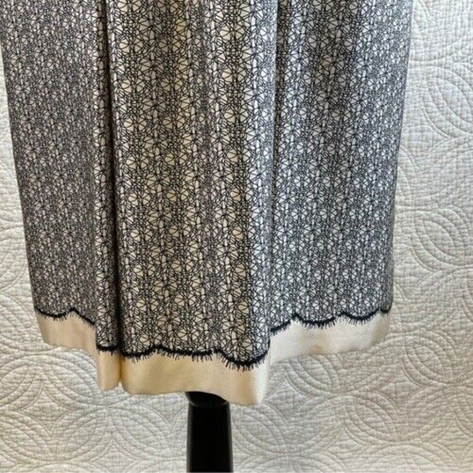 Pre-Owned Women’s Miss Wu Lace Print Silk Twill Dress, Cream & Black color, Sz 10 Condition is Pre-owned.