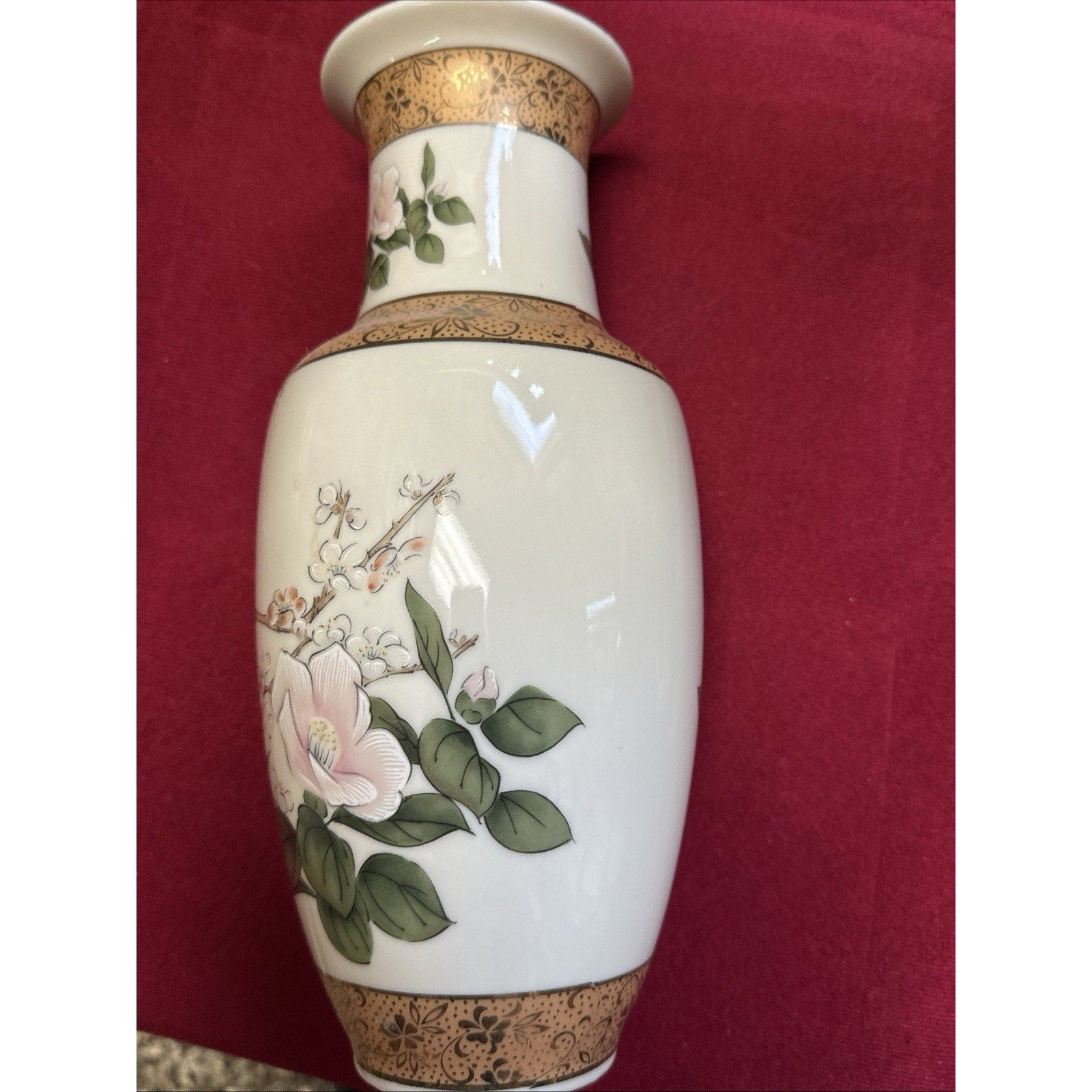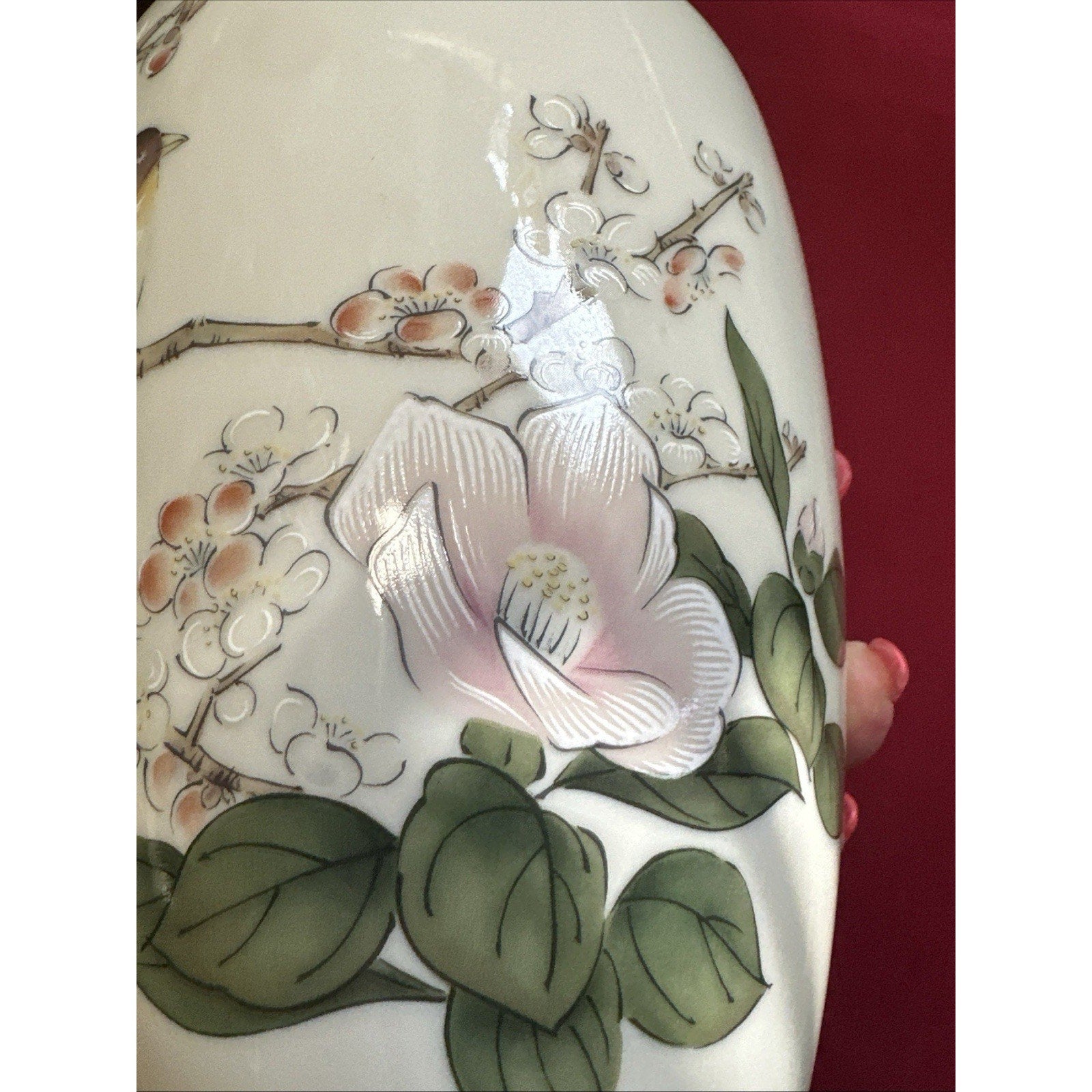 Rare Mid-Century Japan Porcelain Floral Vase Hand painted Birds & Magnolia, 10”H