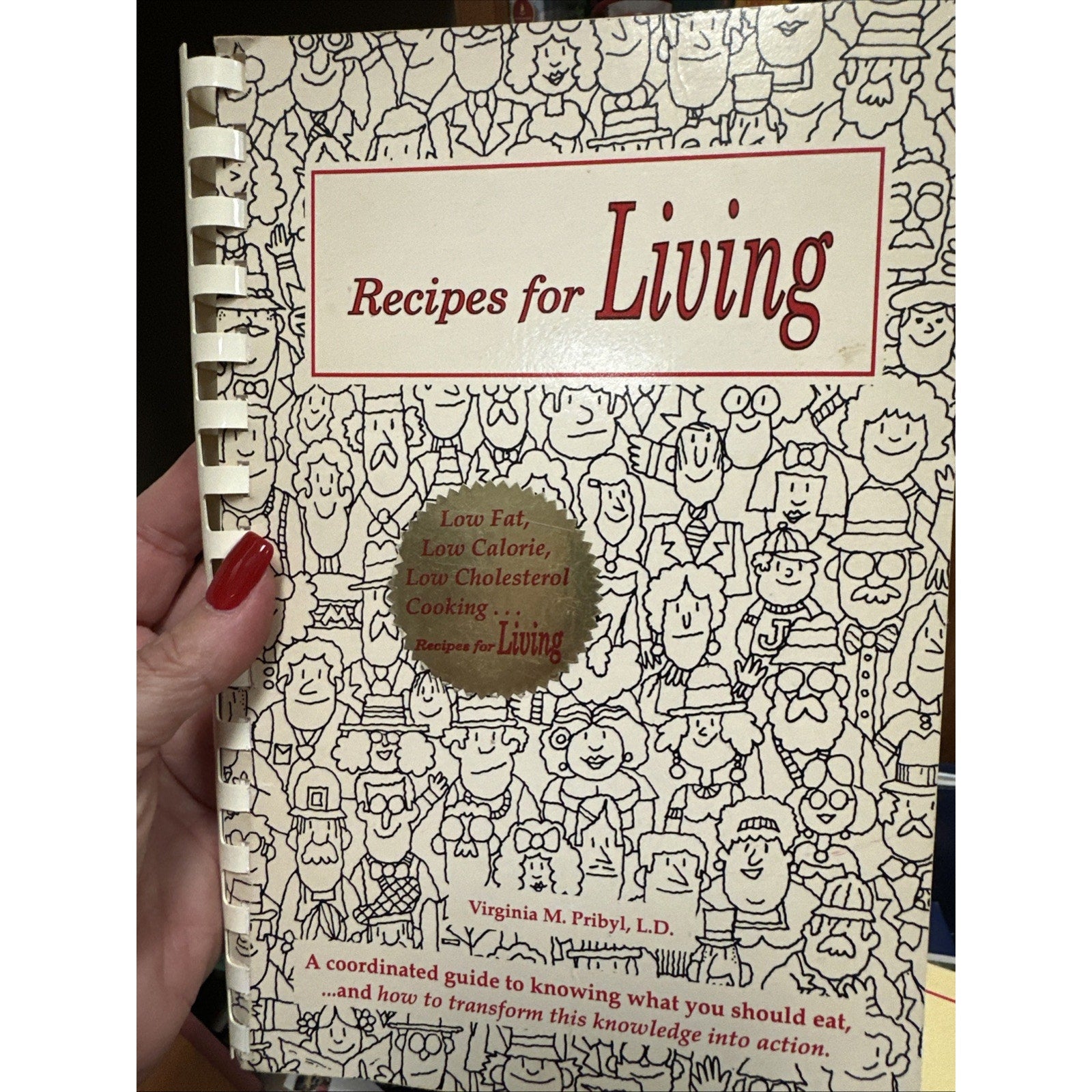 The product is a vintage softcover spiral-bound book titled "Recipes For Living" by Virginia M. Pribyl, published in 1988. It is a nonfiction book aimed at adults, featuring a collection of healthy recipes, including low cholesterol and low-fat cooking, baking, and other nutritious dishes. The book is written in English and was produced in the United States, making it an authentic piece of 1980s cookbook nostalgia.