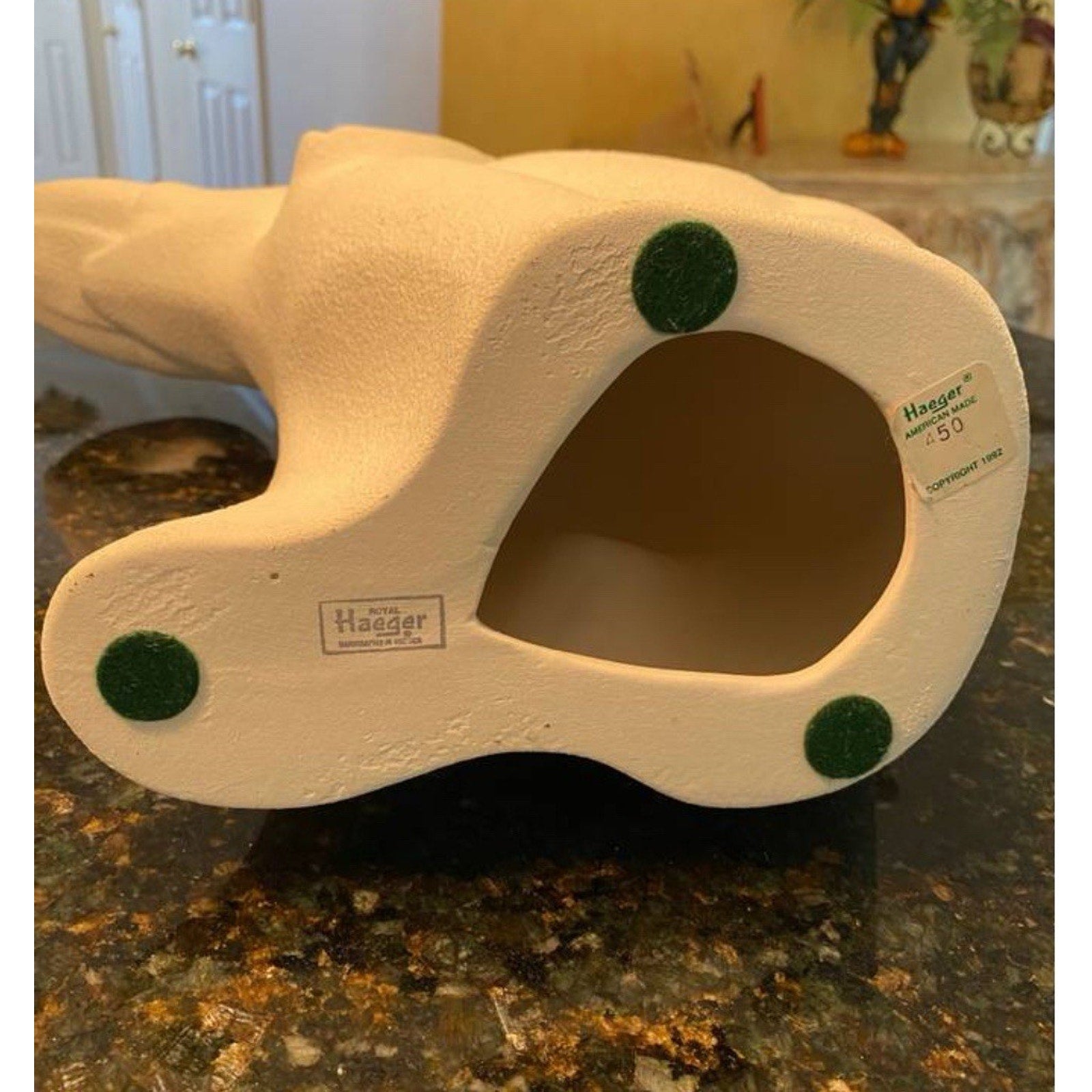 The Royal Haeger elephant sculpture is a pair of vintage figurines depicting elephants. Made by the renowned brand Haeger, these decorative pottery pieces are intricately designed to showcase the majesty of these large mammals. Perfect for collectors or those looking to add an elegant touch to their home decor, this pair of vintage figurines is a unique and charming addition to any space.