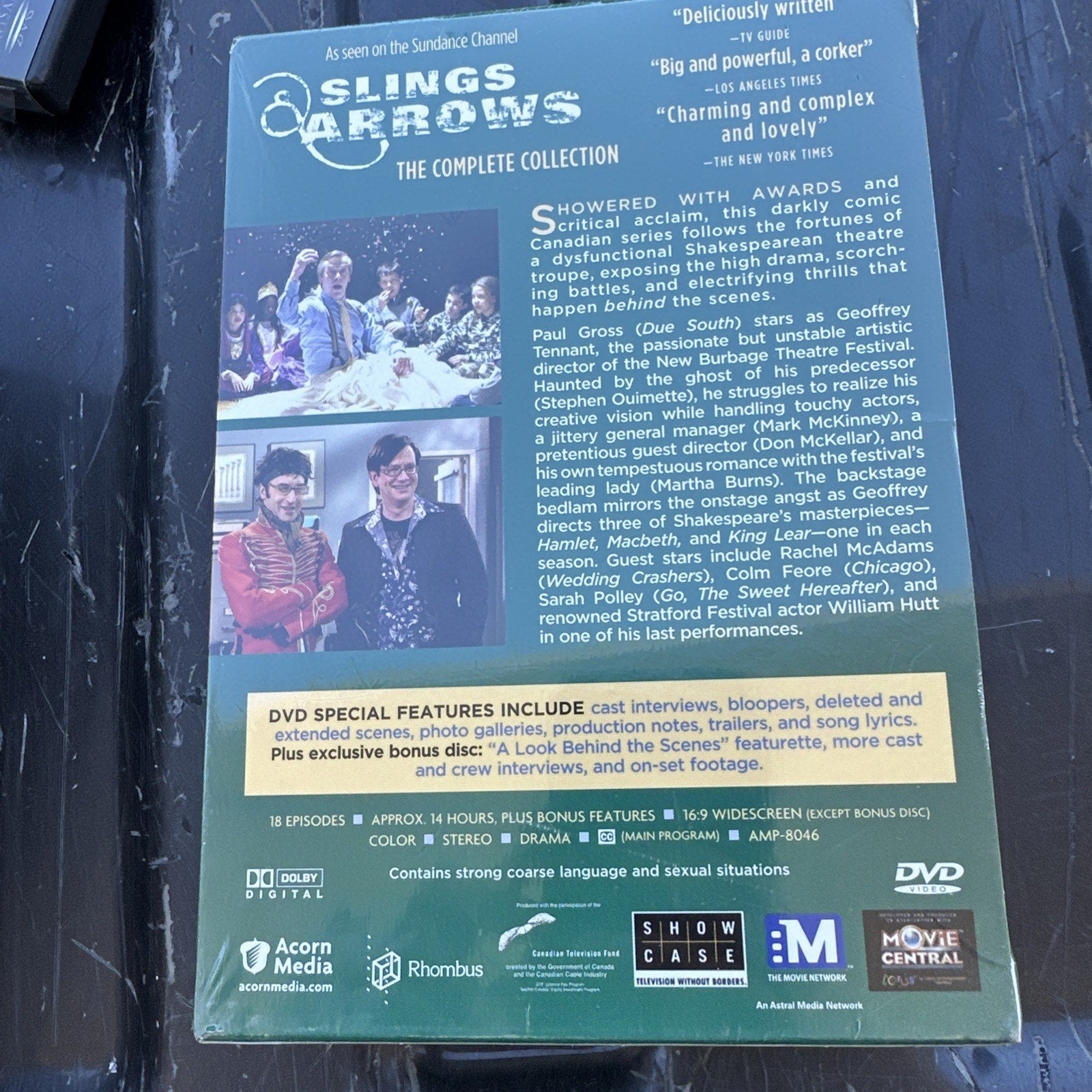 Get ready to laugh out loud with the complete collection of Slings & Arrows on DVD. This 7-disc set features all 39 episodes of the hit comedy series, starring Martha Burns, Paul Gross, Stephen Ouimette, and Don McKellar. Released in 2008, this NR-rated collection is perfect for fans of the genre and the cast.