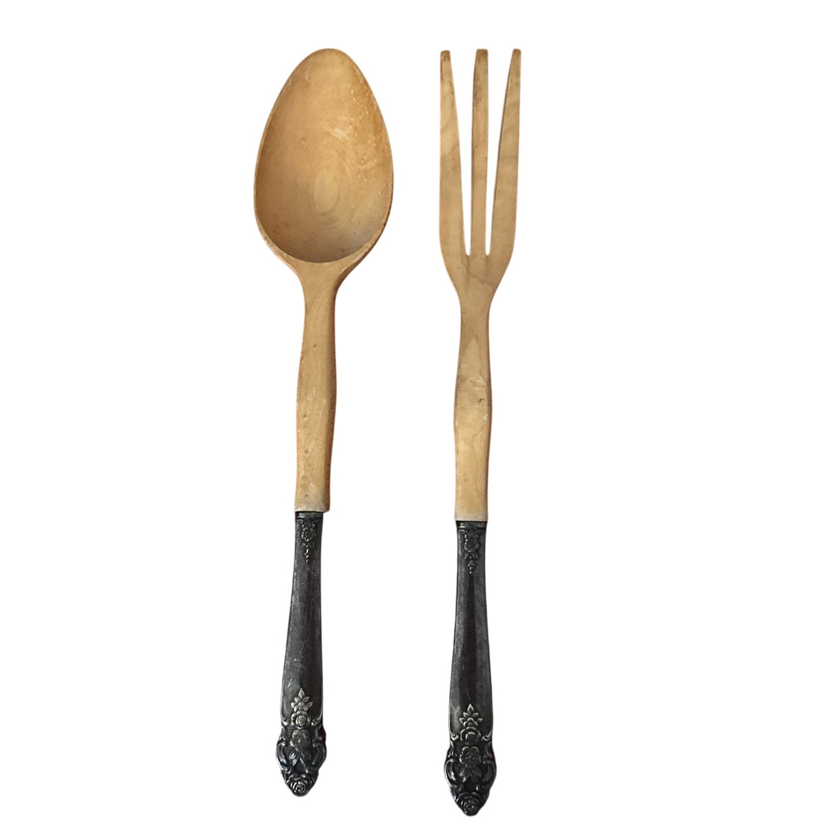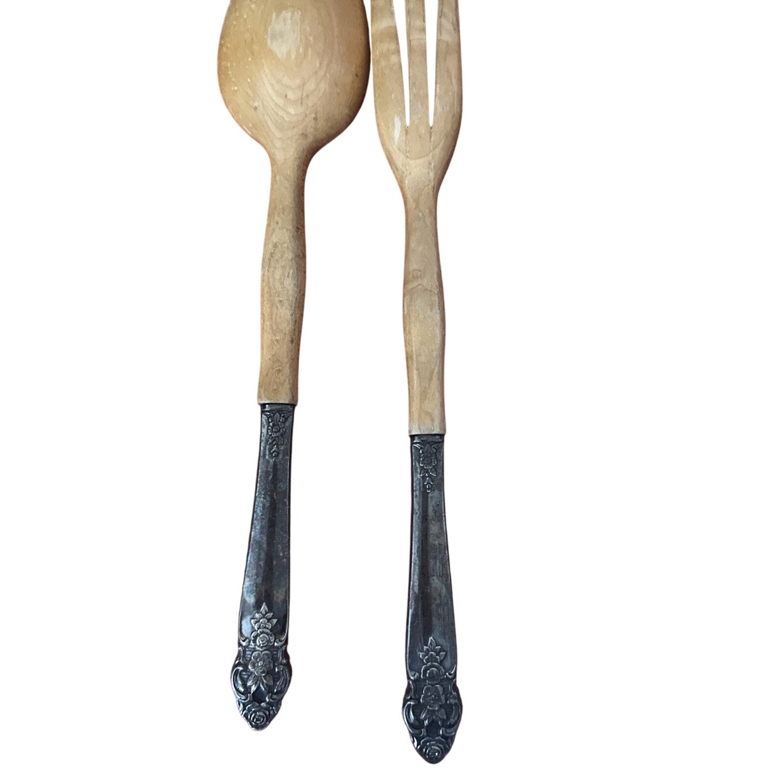 This vintage salad serving set from the 1960s features a unique combination of sterling silver and teak wood handles. The set includes a spoon, fork, and tong, making it practical for serving salads and other dishes during that era. The mix of materials and mid-century design add a touch of retro charm to any table setting, making it a desirable collectible for those interested in vintage flatware.