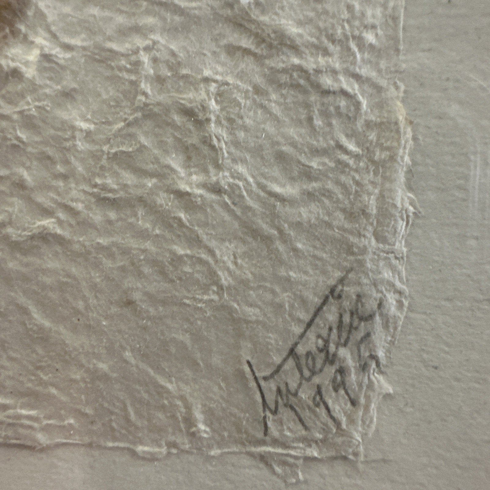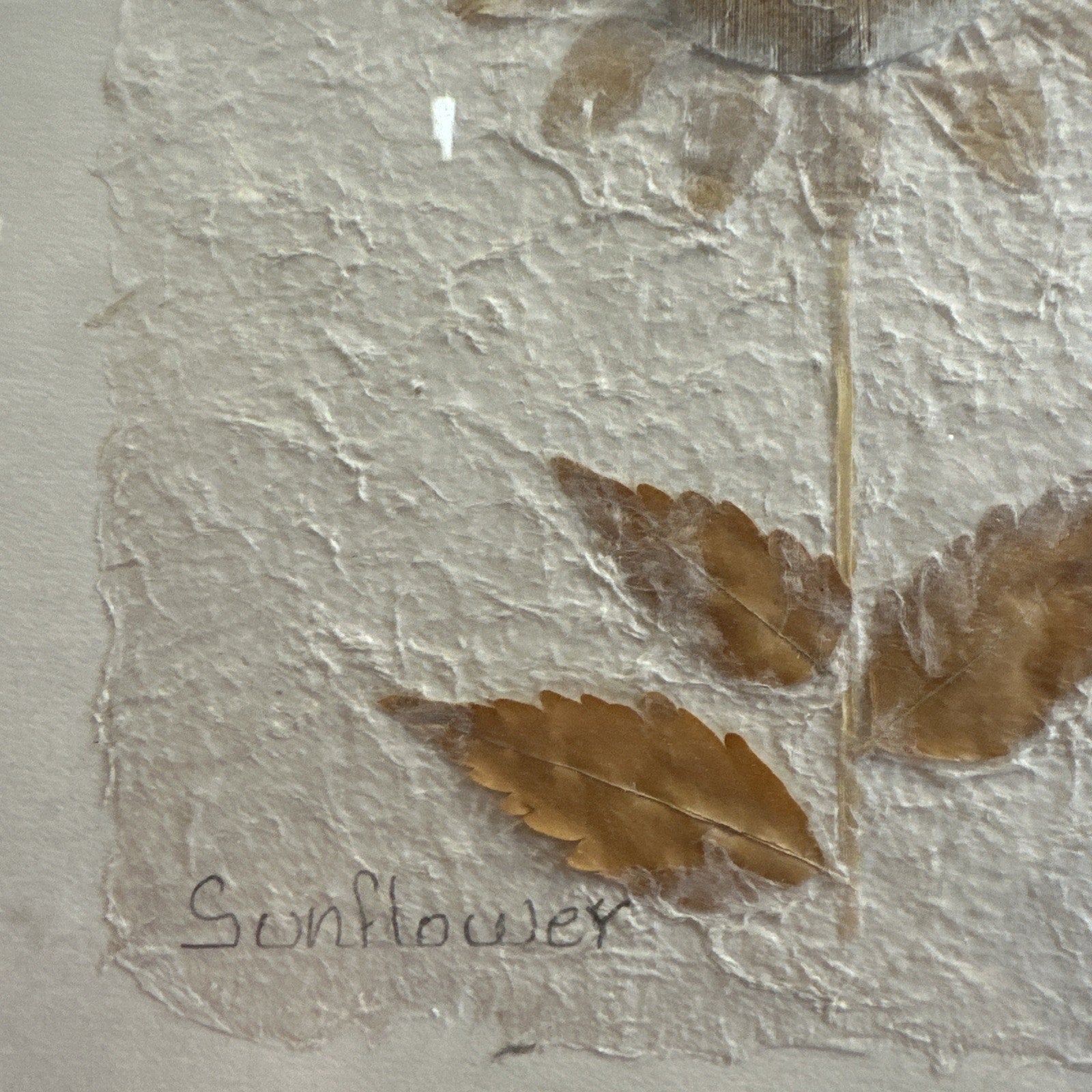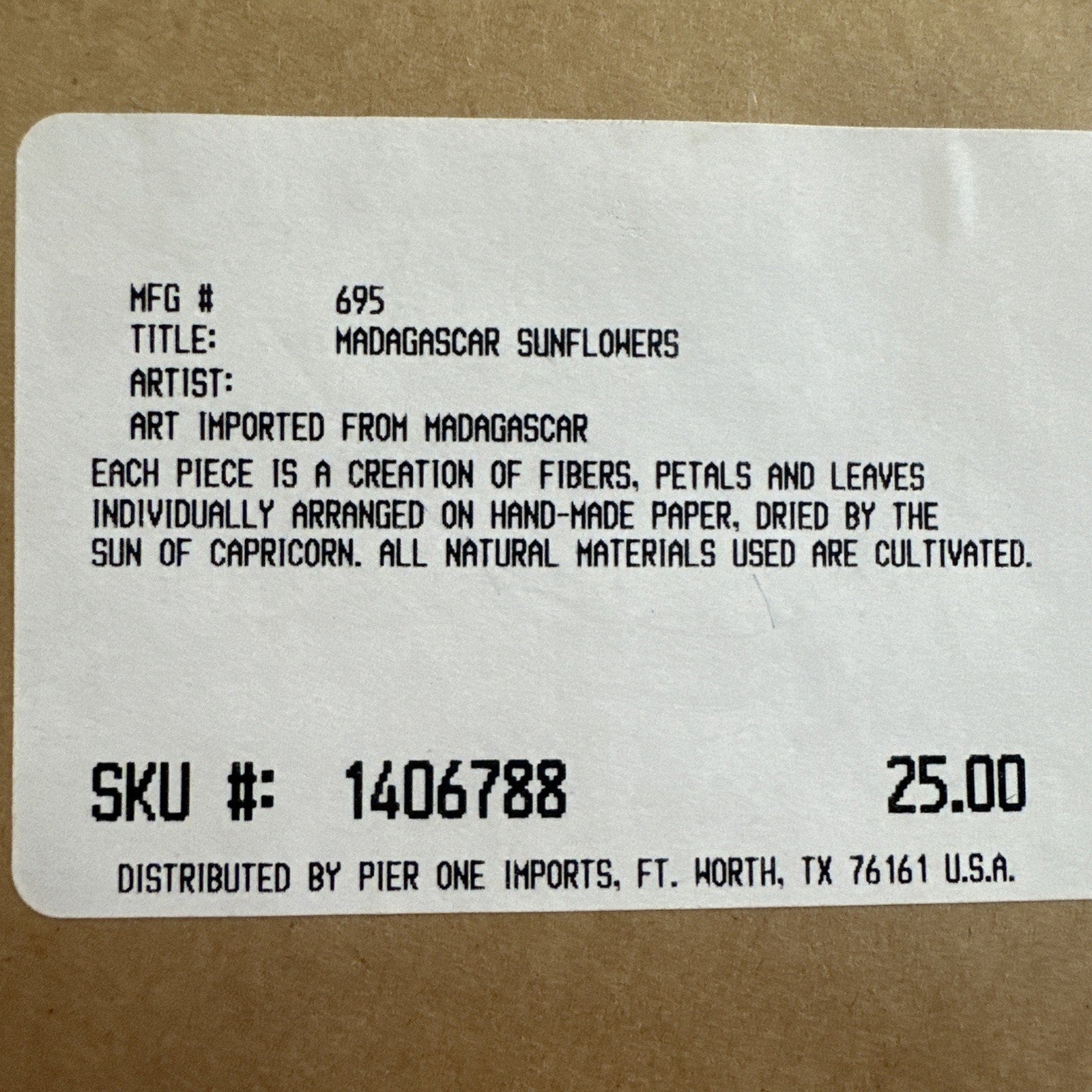 "Sunflowers" by artist Interia, imported from Madagascar in 1995 for Pier One. Measuring 12.75"x10.75", the piece features sunflowers as its subject and is signed by the artist. Produced in 1996, this original artwork uses natural materials arranged on handmade paper, reflecting a folk and indigenous style. Displaying a unique blend of materials and craftsmanship, this piece showcases the creativity and craftsmanship of the artist.