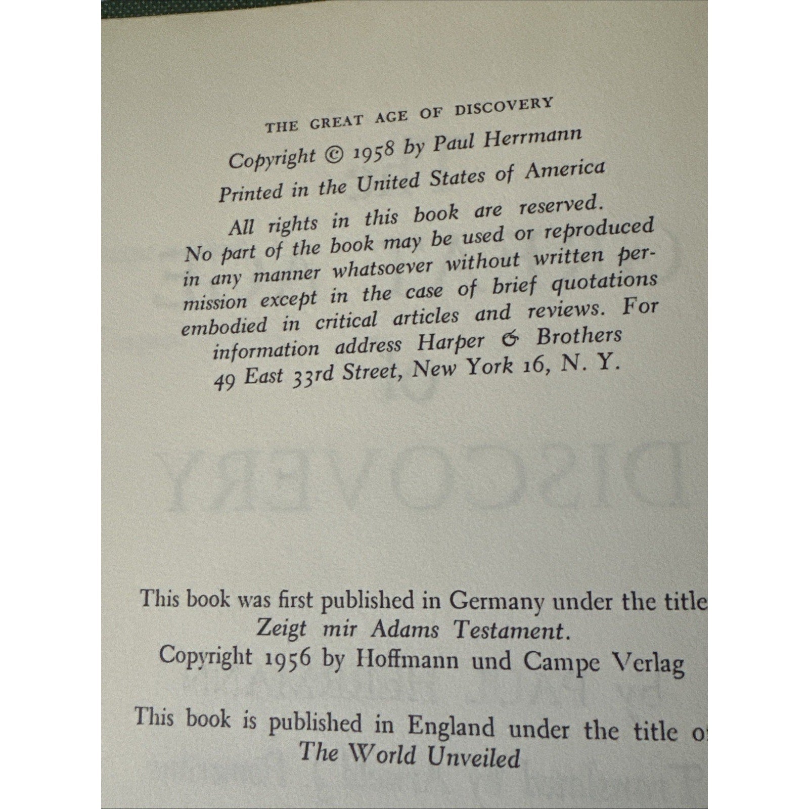 "The Great Age of Discovery" by Paul Herrmann is a first edition hardcover book published by Harper. This historical work is written in English and includes special attributes such as a dust jacket. A valuable addition to any collector's library, this original book by Herrmann delves into the fascinating subject of history, making it a prized possession for those interested in exploration and discovery.