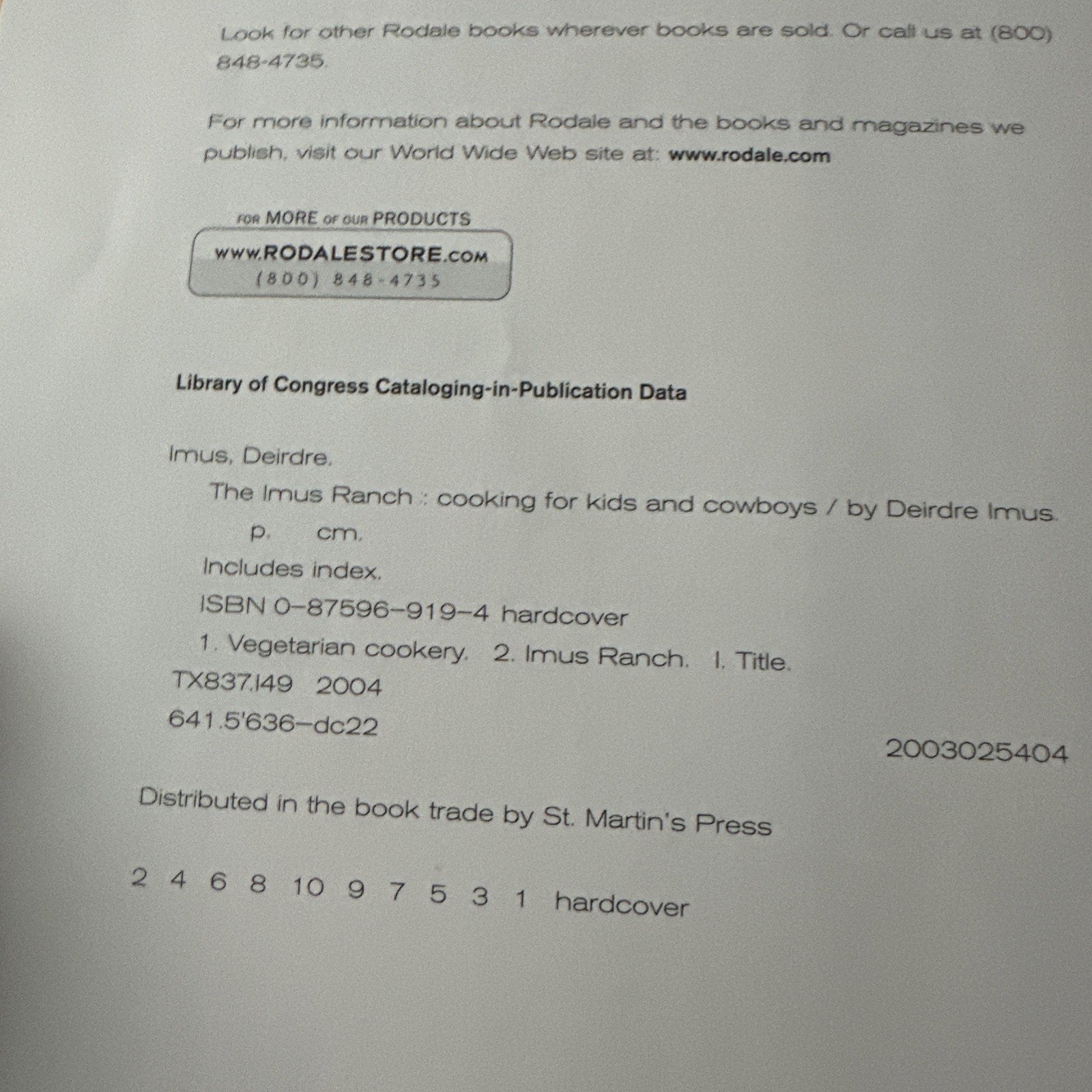 The Imus Ranch: Cooking for Kids and Cowboys by Deirdre Imus is a must-have cookbook for anyone who loves to cook healthy and delicious meals. This hardcover book, published in 2004 by Potter/Ten SPEED/Harmony/Rodale, contains 224 pages of vegetarian recipes that are perfect for families and cowboys alike.