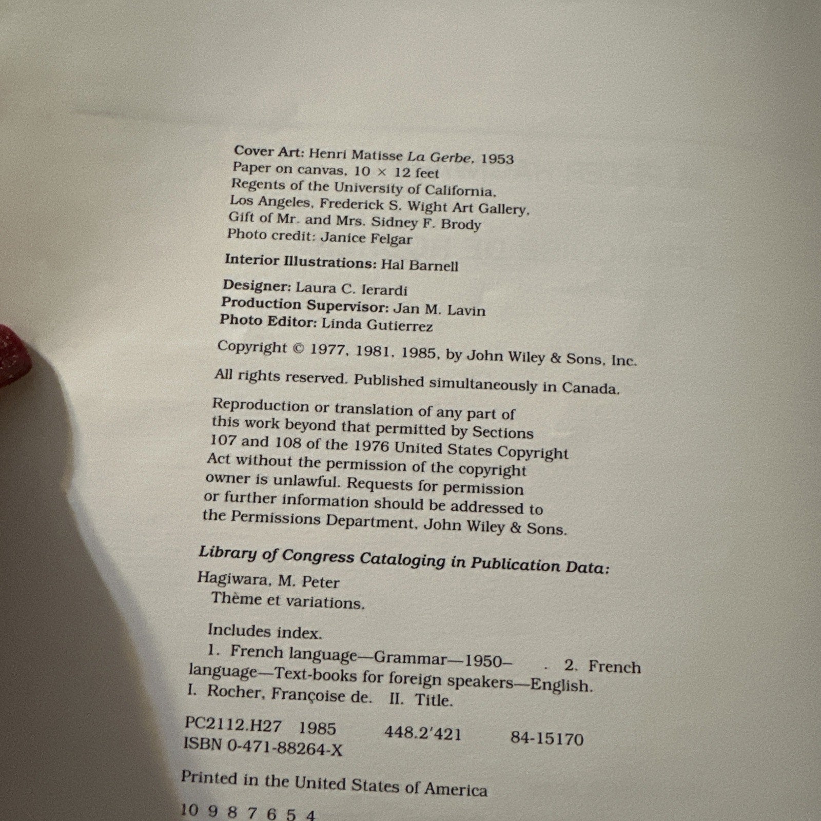 "Theme et Variations: An Introduction to French Language and Culture" is a comprehensive language course published in 1977 by Wiley & Sons, Incorporated, John. Authored by Peter M. Hagiwara and Francoise De Rocher, this hardcover book spans 557 pages and is designed for foreign language study with a focus on French. The book is presented in English, making it accessible to a wide range of learners looking to immerse themselves in the French language and culture. With its detailed insights and information, this textbook is a valuable resource for anyone seeking to deepen their understanding of the French language and its cultural significance.