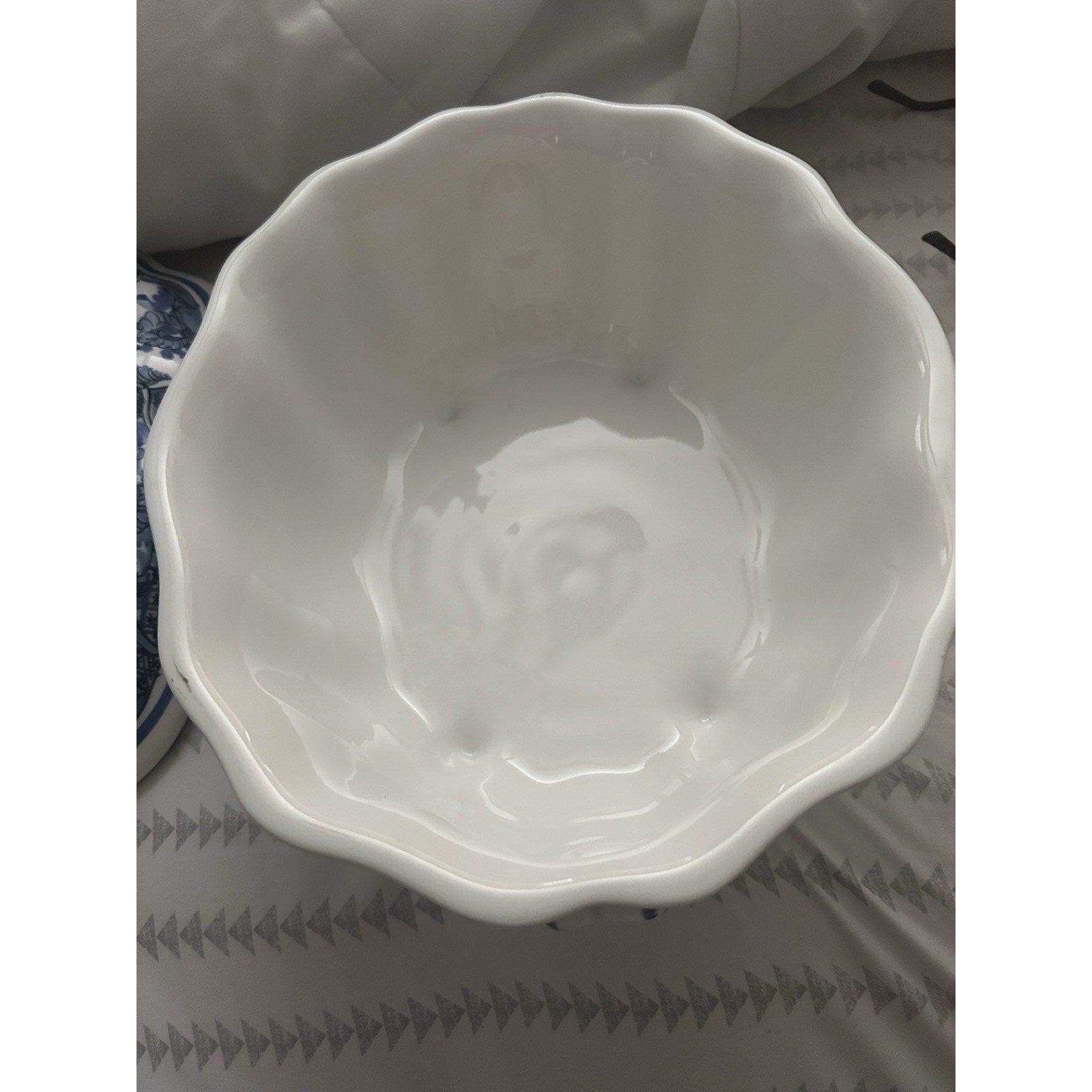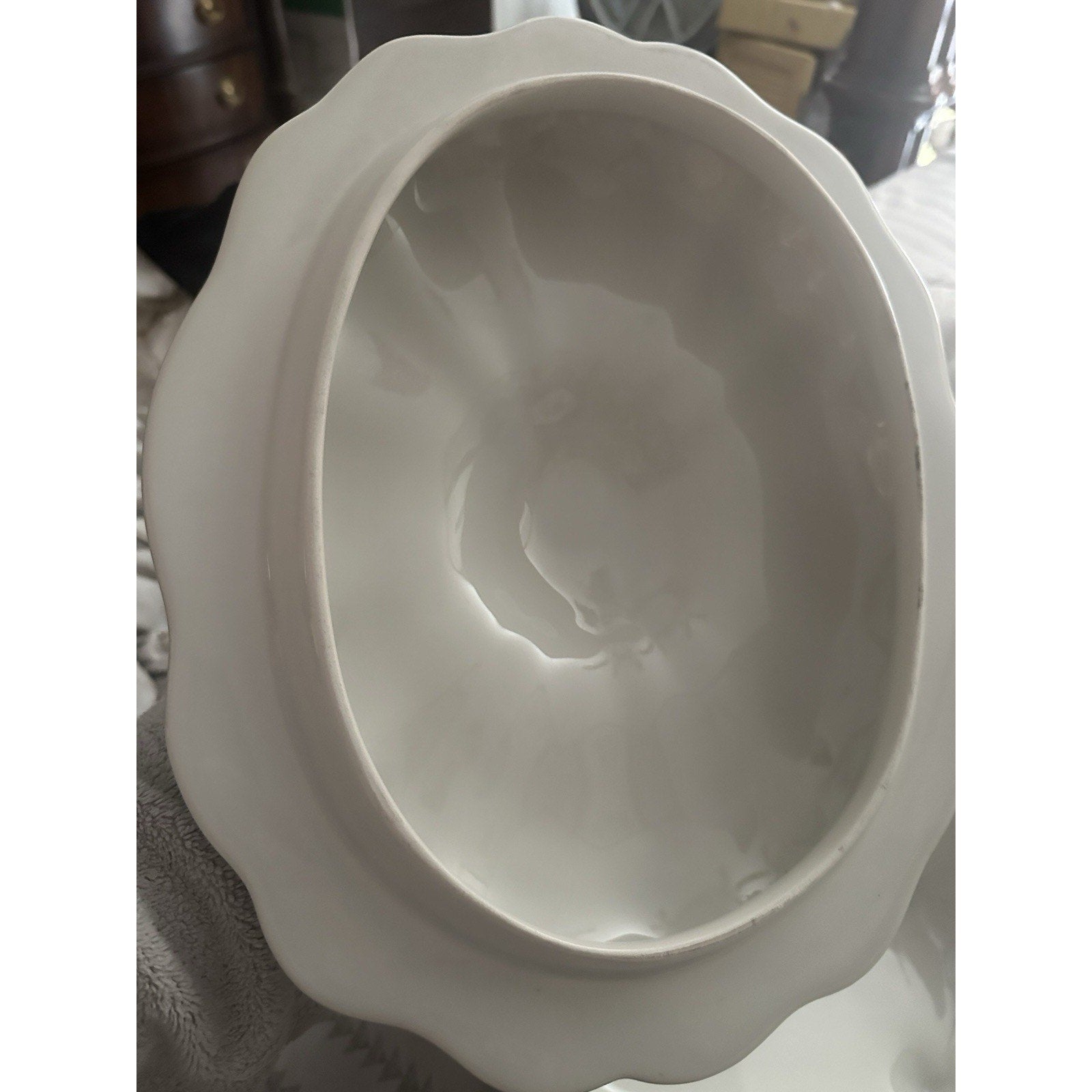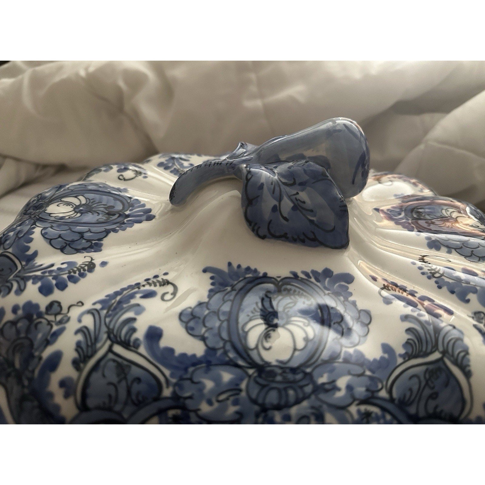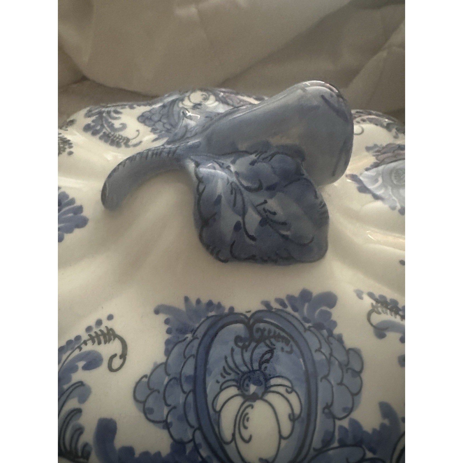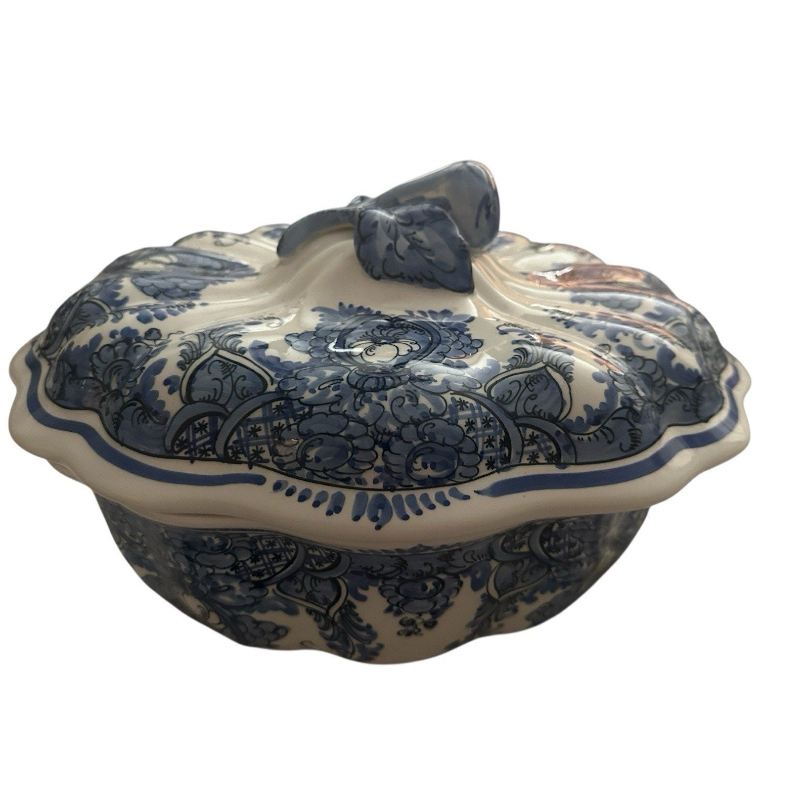 Beautiful large tureen with a lid, featuring a hand-painted design in blue and white colors. The intricate painting adds a touch of elegance to this rare collectible piece. Perfect for serving soups or stews, this tureen adds a unique and decorative element to any dining table or collection of kitchenware.