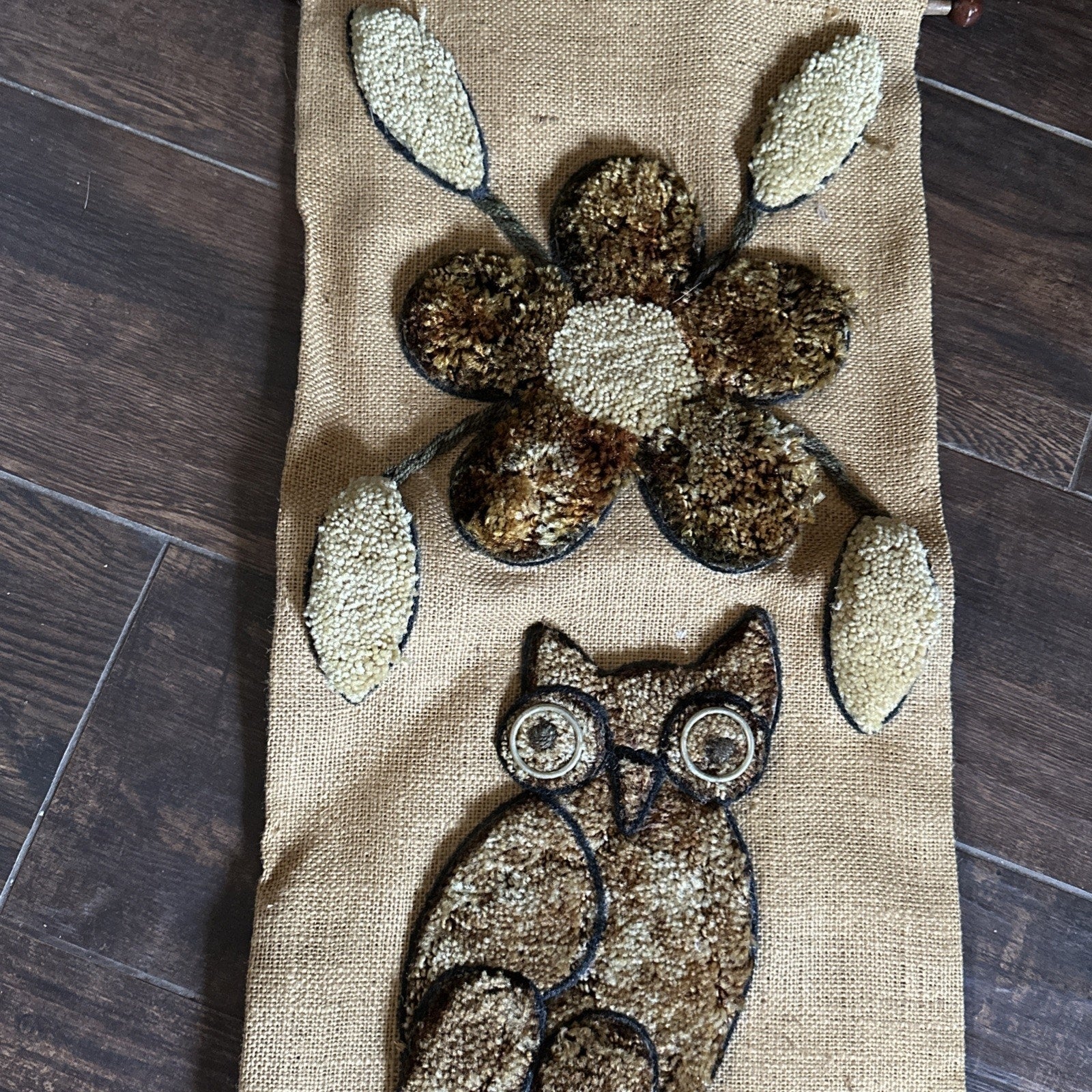 Vintage 1970’s Latch Hook Shag On Burlap With Owl And Flowers Wear With Age