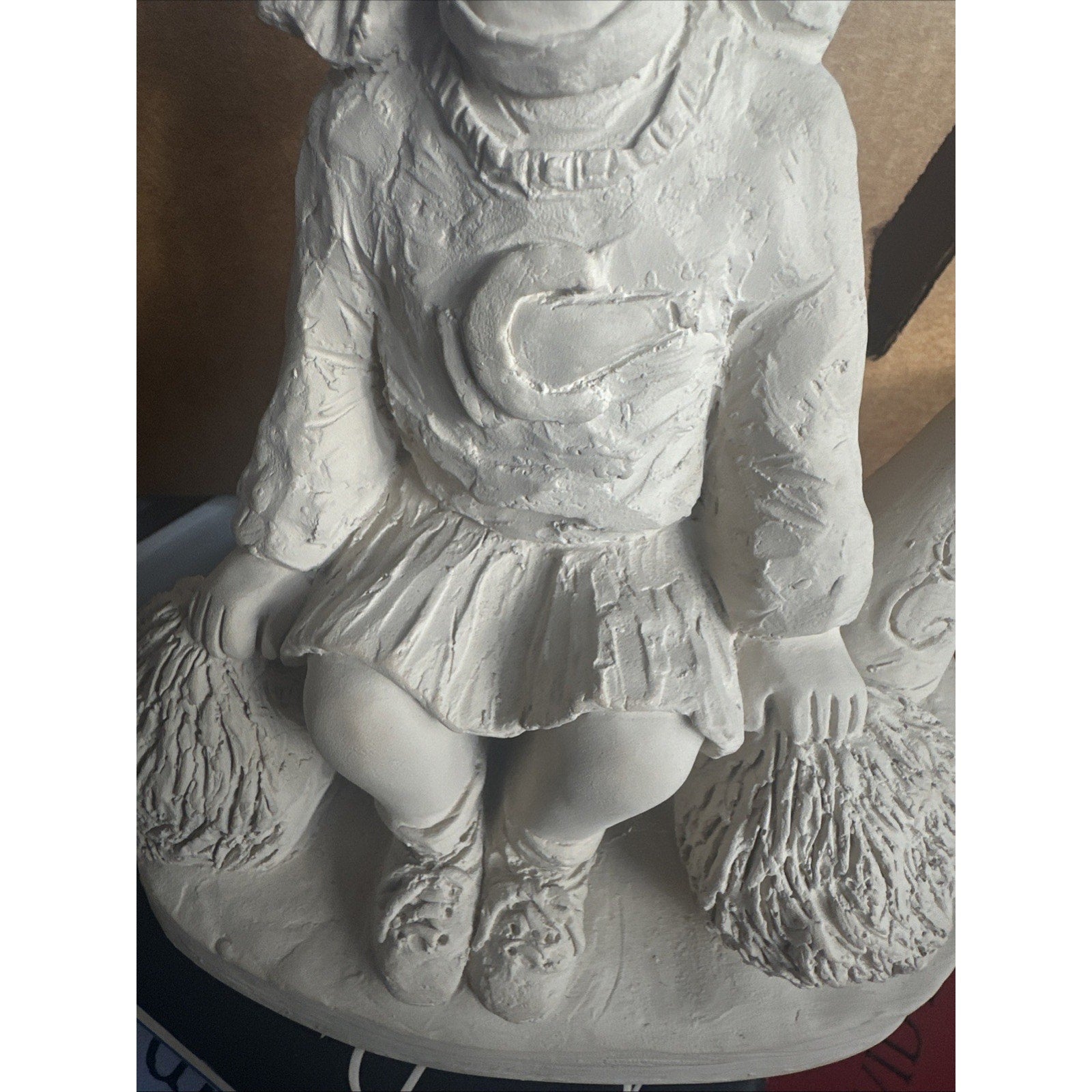 The Vintage Austin Sculpture Lil Cheerleader by artist Dee Crowley is a ceramic figurine from the 90s. It features a solid beige color with bright eyes, standing at 9 inches tall and 7 inches long. Handmade and signed by the artist, this limited edition piece is perfect for any room in the bedroom or for collectors of decorative figurines. Made of clay and depicting a cheerleader theme, this unique sculpture adds a touch of nostalgia and charm to its surroundings.