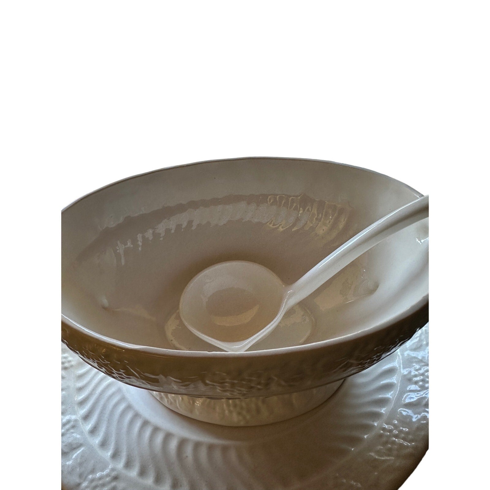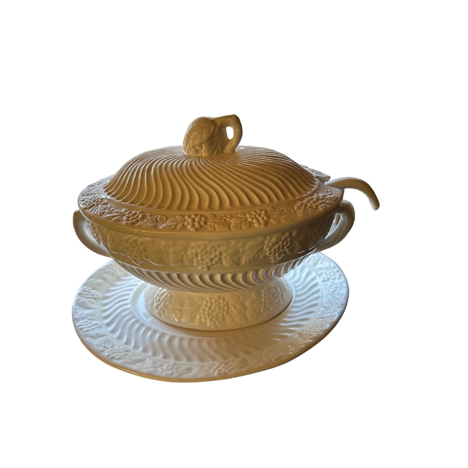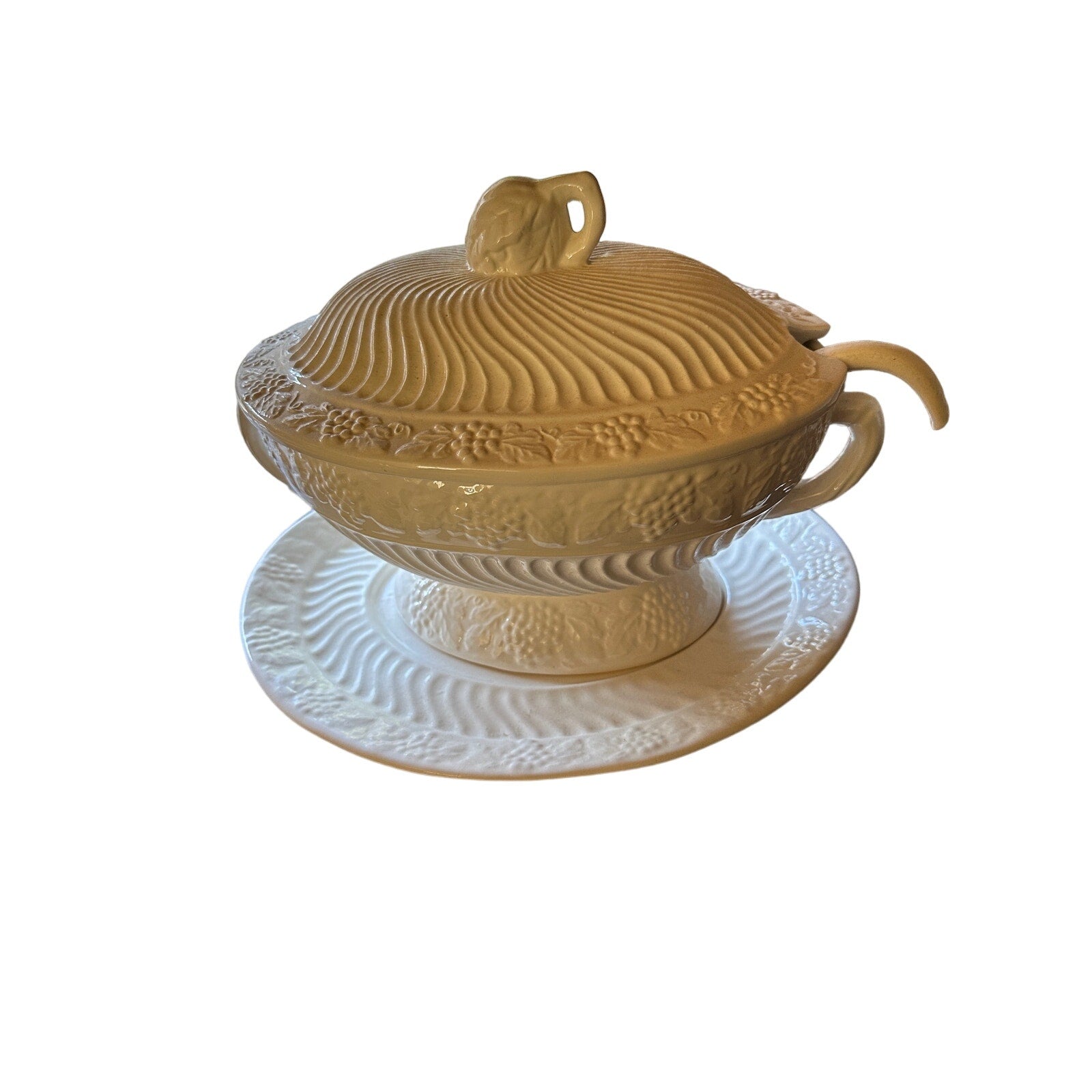 Vintage California Pottery Large White Soup Tureen Swirled with Grapes- 3 Pieces