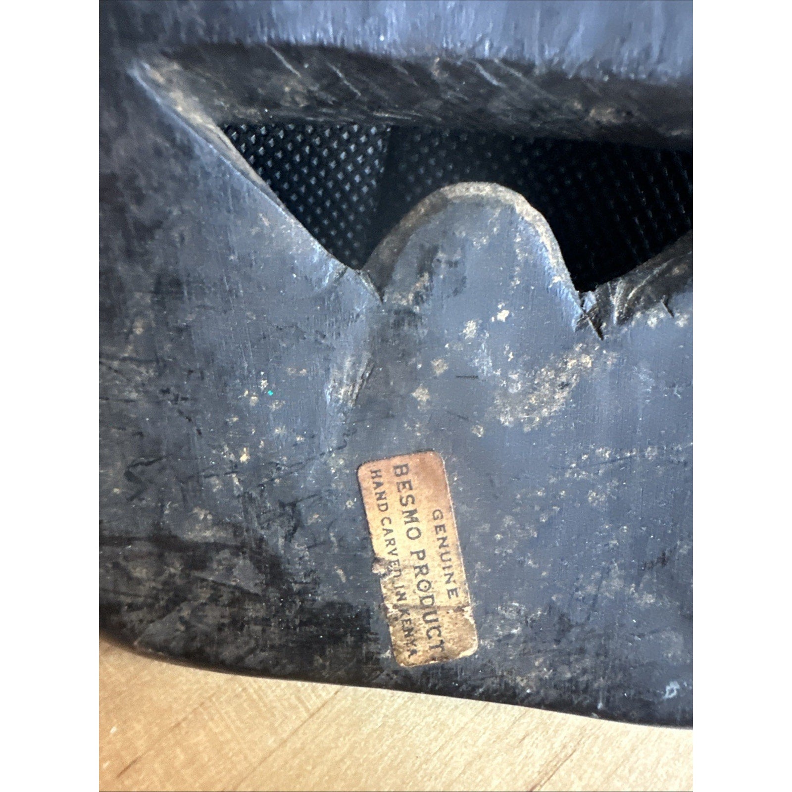 This vintage African tribal warriors mask is a unique and culturally significant piece carved from ebony wood in Namibia. Measuring 12 inches, this intricately crafted mask showcases traditional African design and craftsmanship, making it a valuable addition to any collection or display. The heavy and sturdy material used in its creation adds an extra layer of authenticity and durability, ensuring its longevity as a piece of African cultural history.