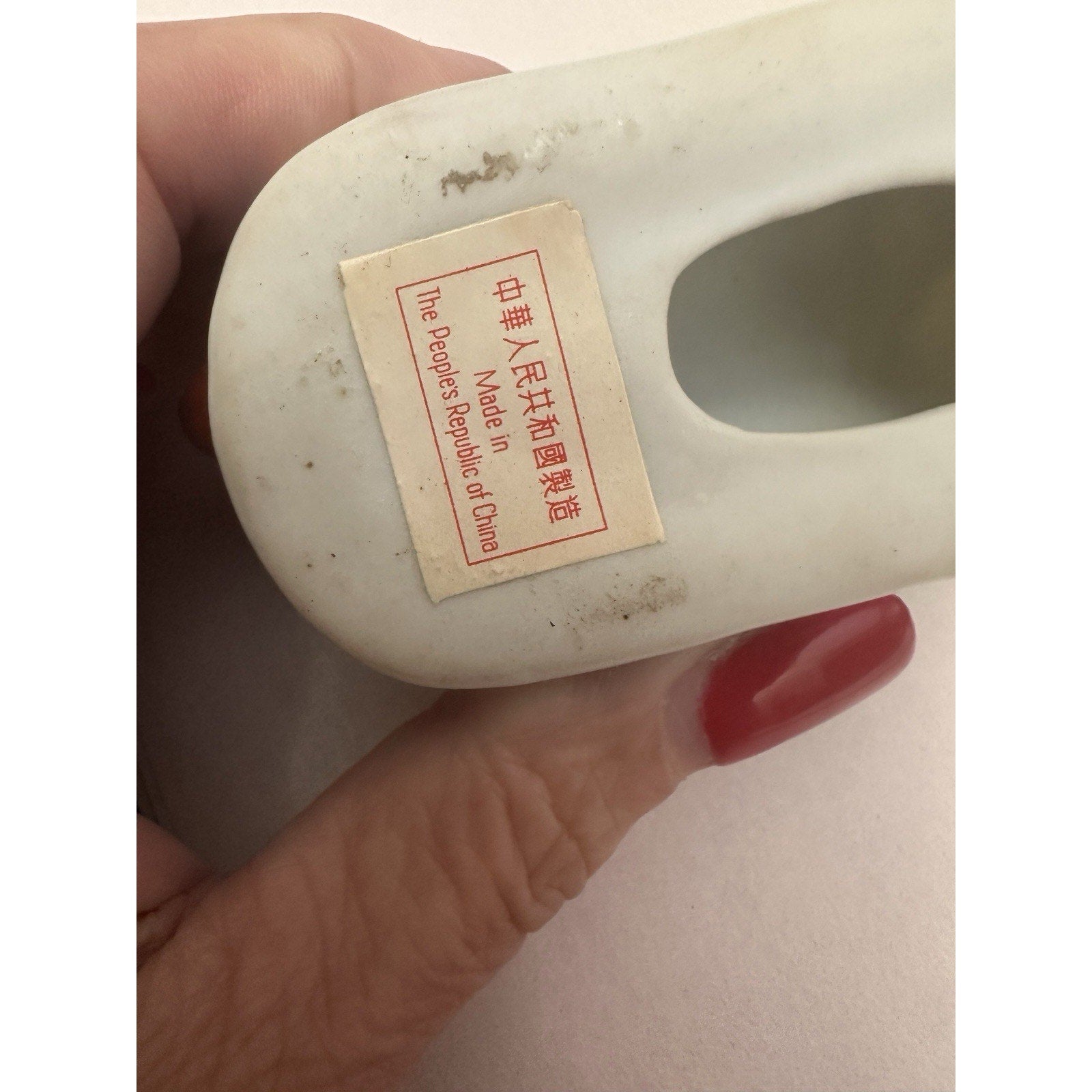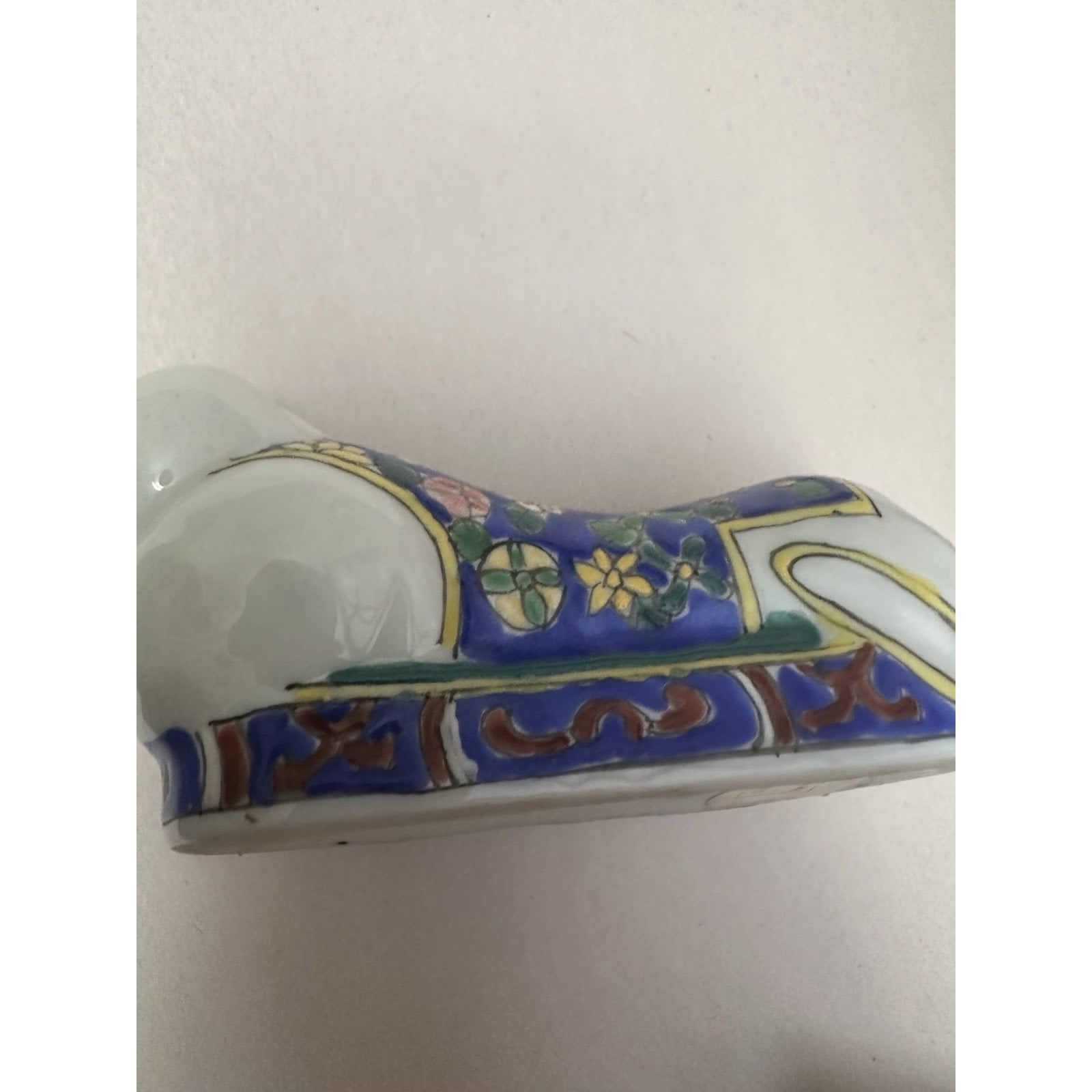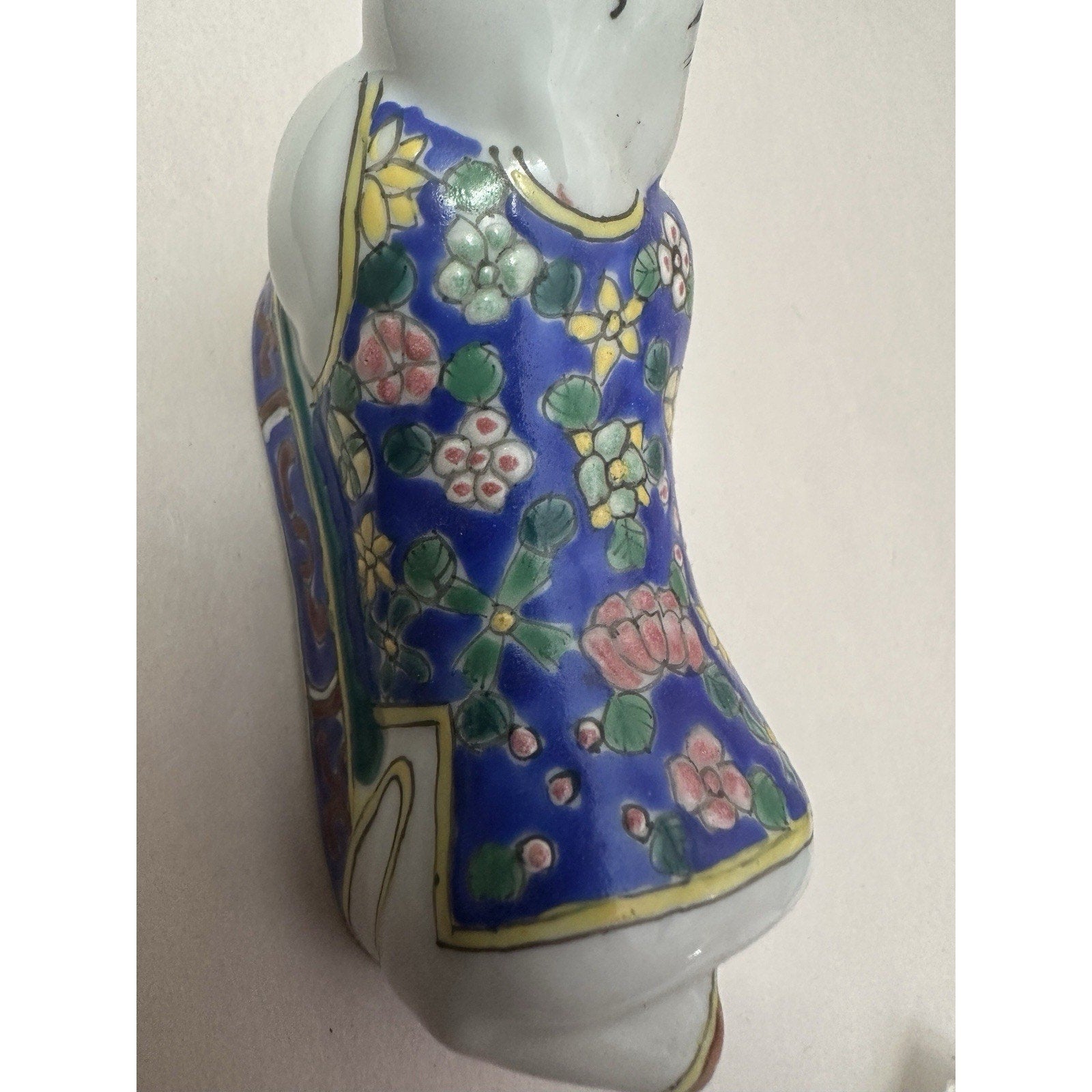 This vintage Chinese export porcelain enamel figurine features a laying child on an opium pillow. The colorful and intricate design showcases men, women, and children, with a multi-color palette that brings the piece to life. Measuring at 1.75 inches in height, this vintage original is a unique addition to any collection. The region of origin is China, making it a true treasure of Asian antiques. Perfect for collectors of figurines and statues, this piece is sure to be a conversation starter.