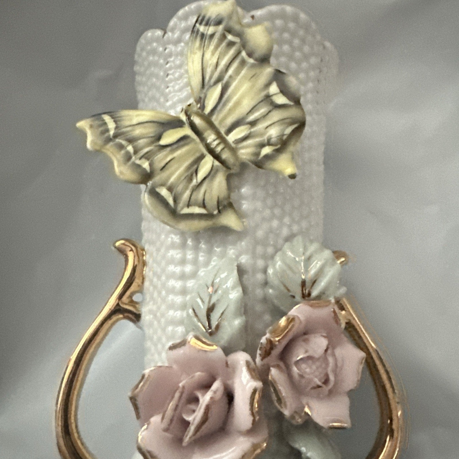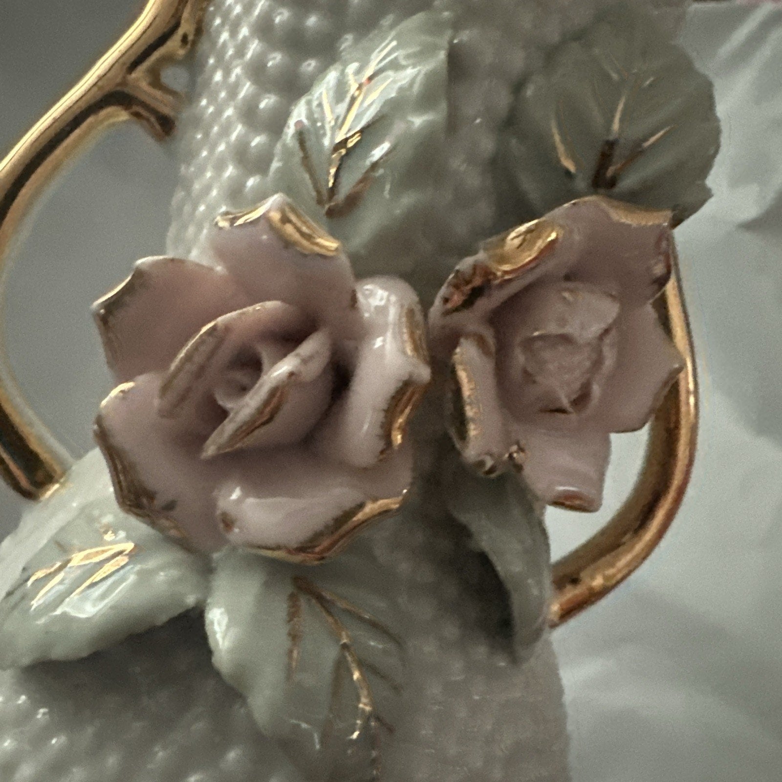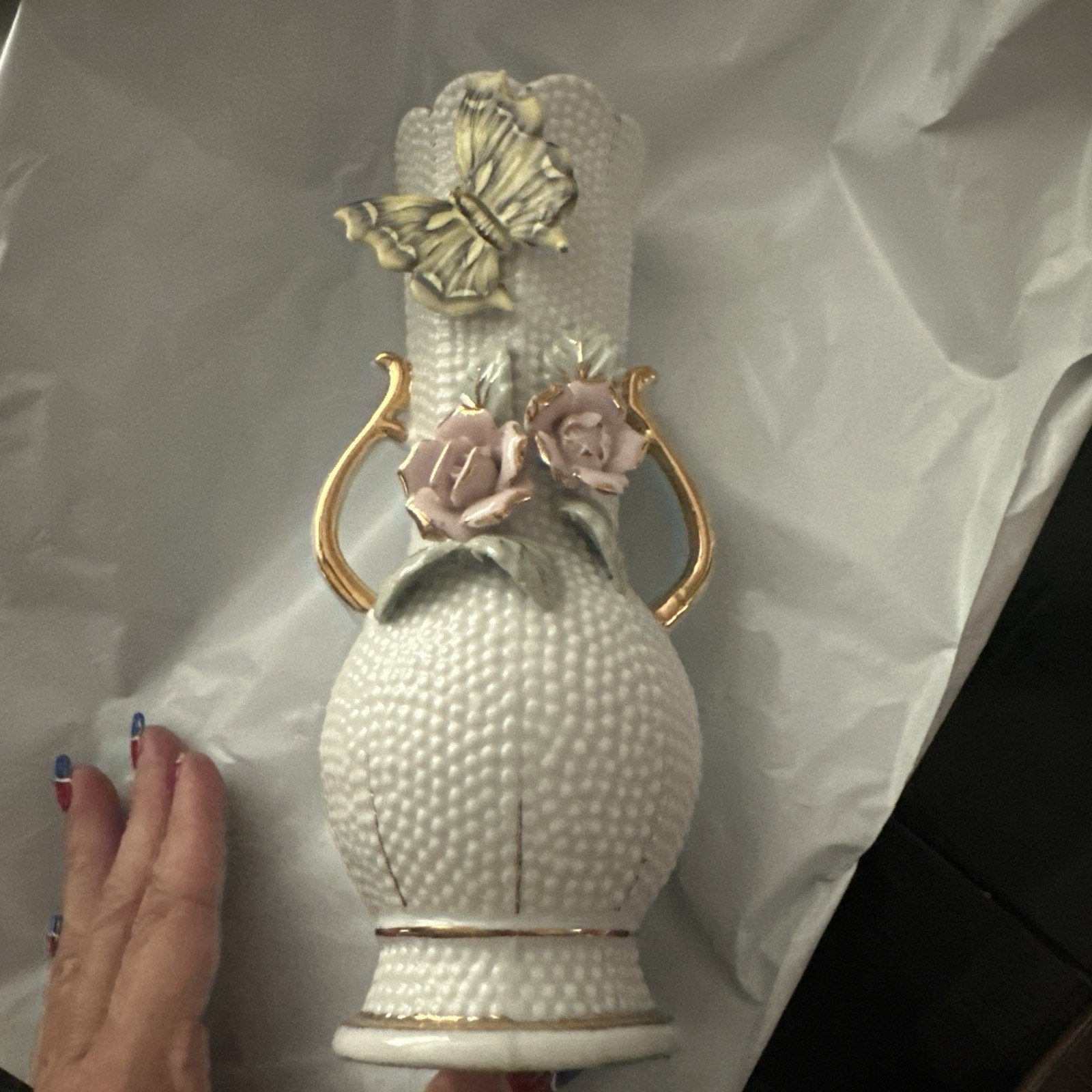 Vintage Double Handled Hobnail Porcelain Bud Vase W/ Gold Trim & Applied Flowers