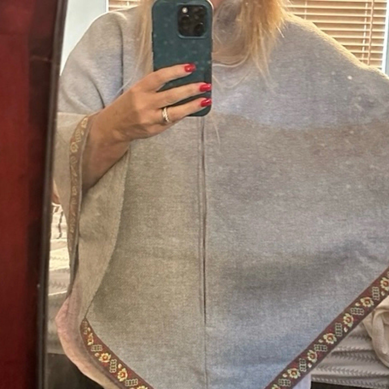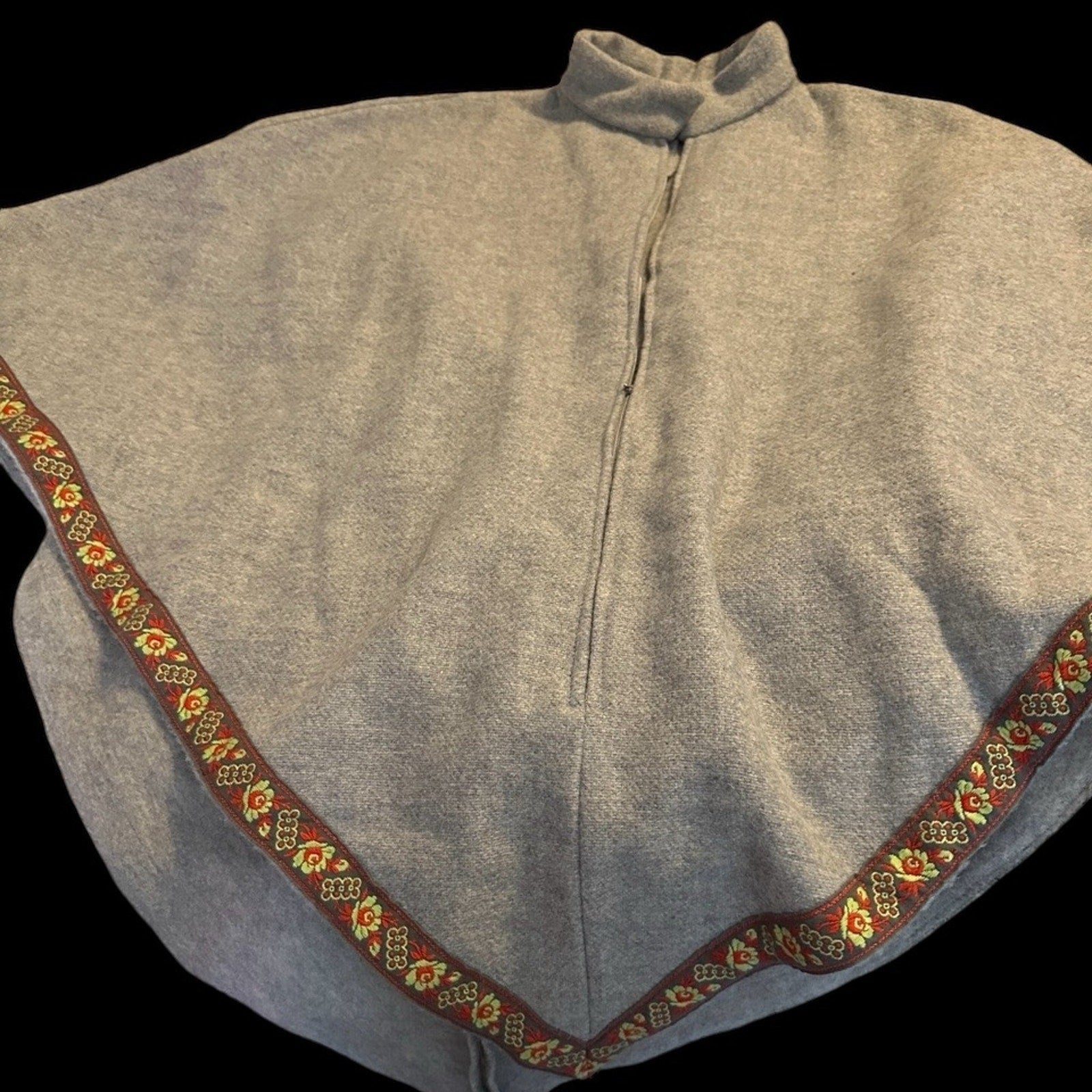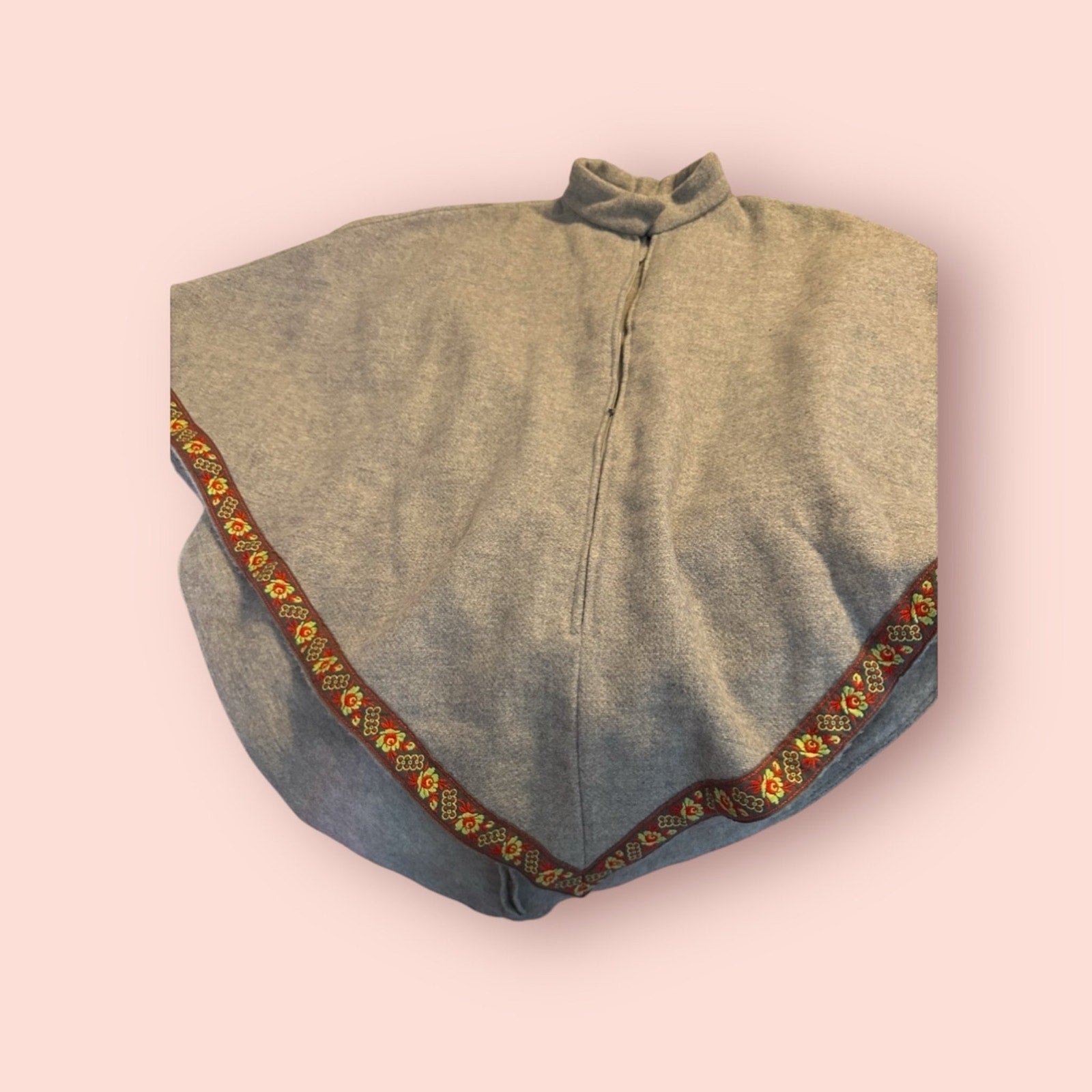 Vintage 100% Wool Poncho One size fits all. Gray poncho with a Aztec pattern. Machine washable in cold water.