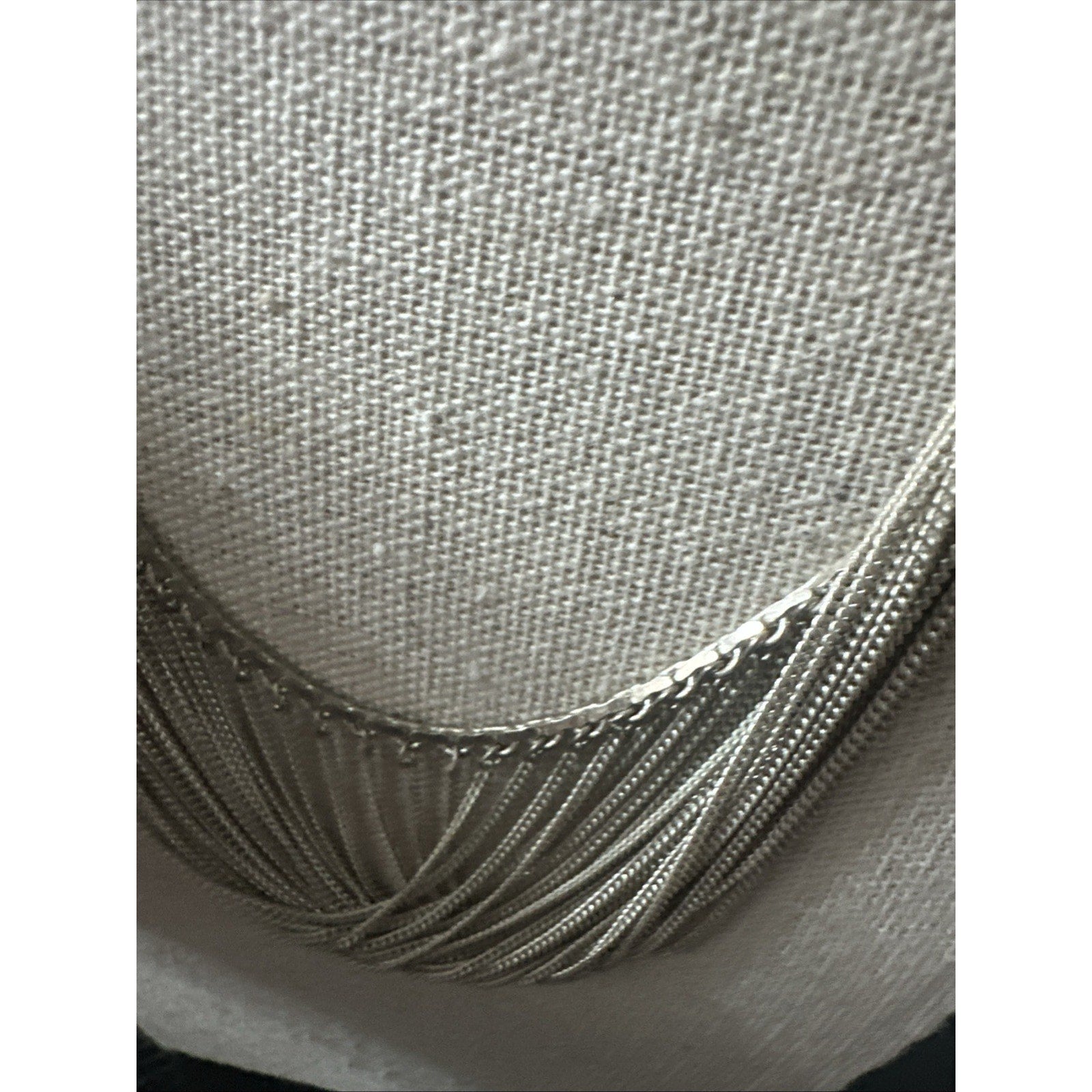 925 sterling silver multi strand chain bib necklace weighing 27.5 grams. It features a unique design with multiple strands of chain and a bib style, making it a statement piece of fine jewelry. With its solid sterling silver construction and lack of a central stone, this necklace offers a classic and elegant look that can be worn for various occasions.