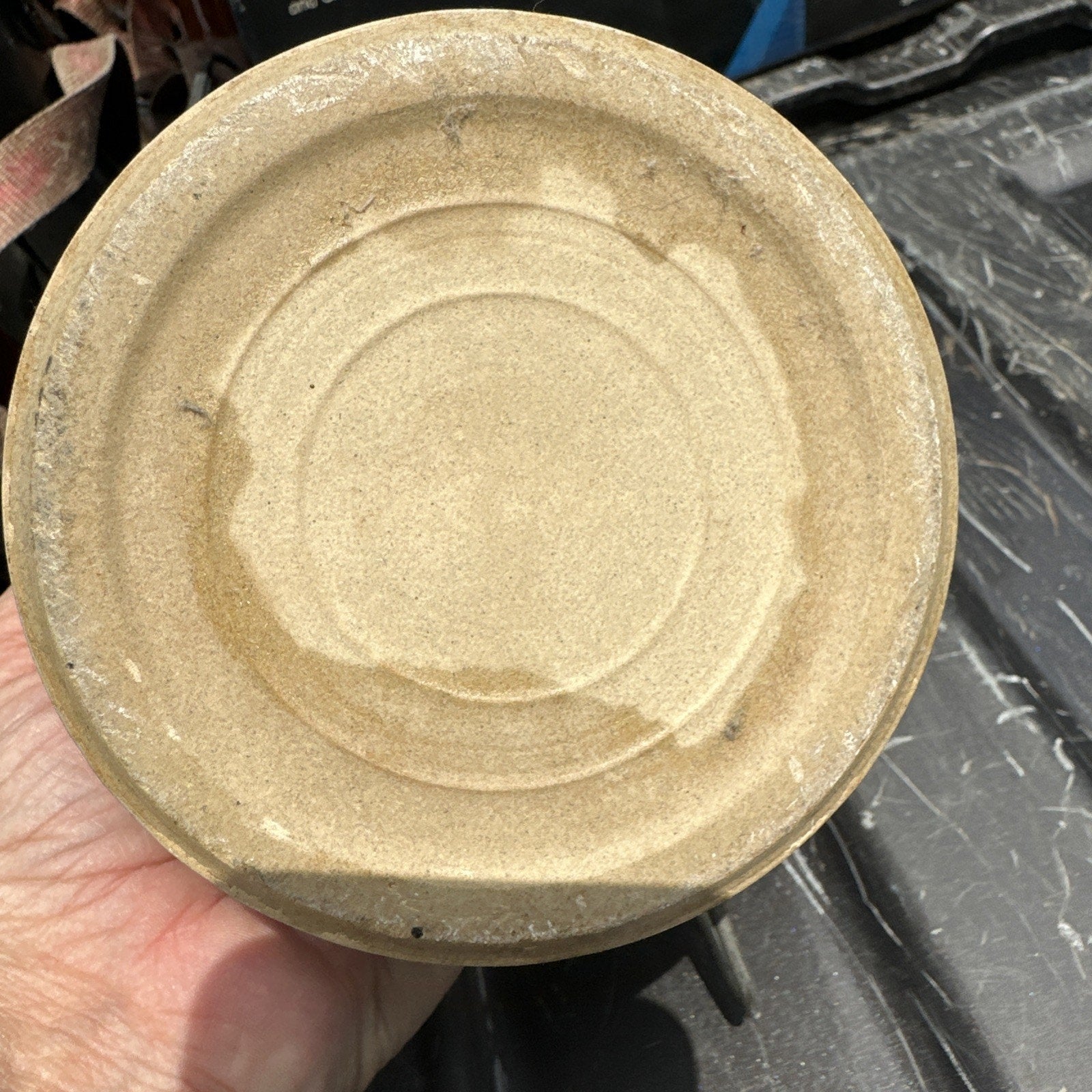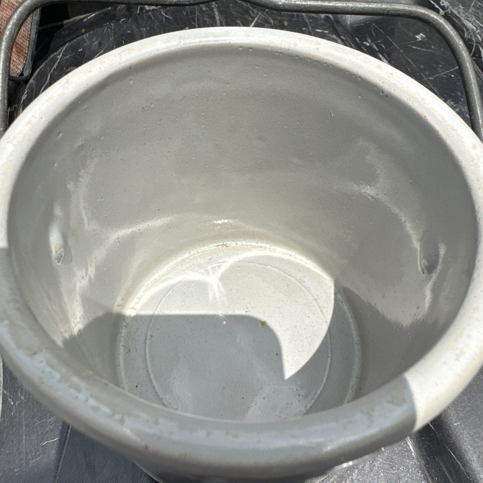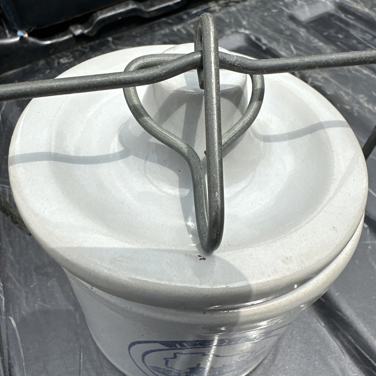 VTG Wisconsin Homestead Lidded Cheese Butter Crock with Bale Wire Close 6in