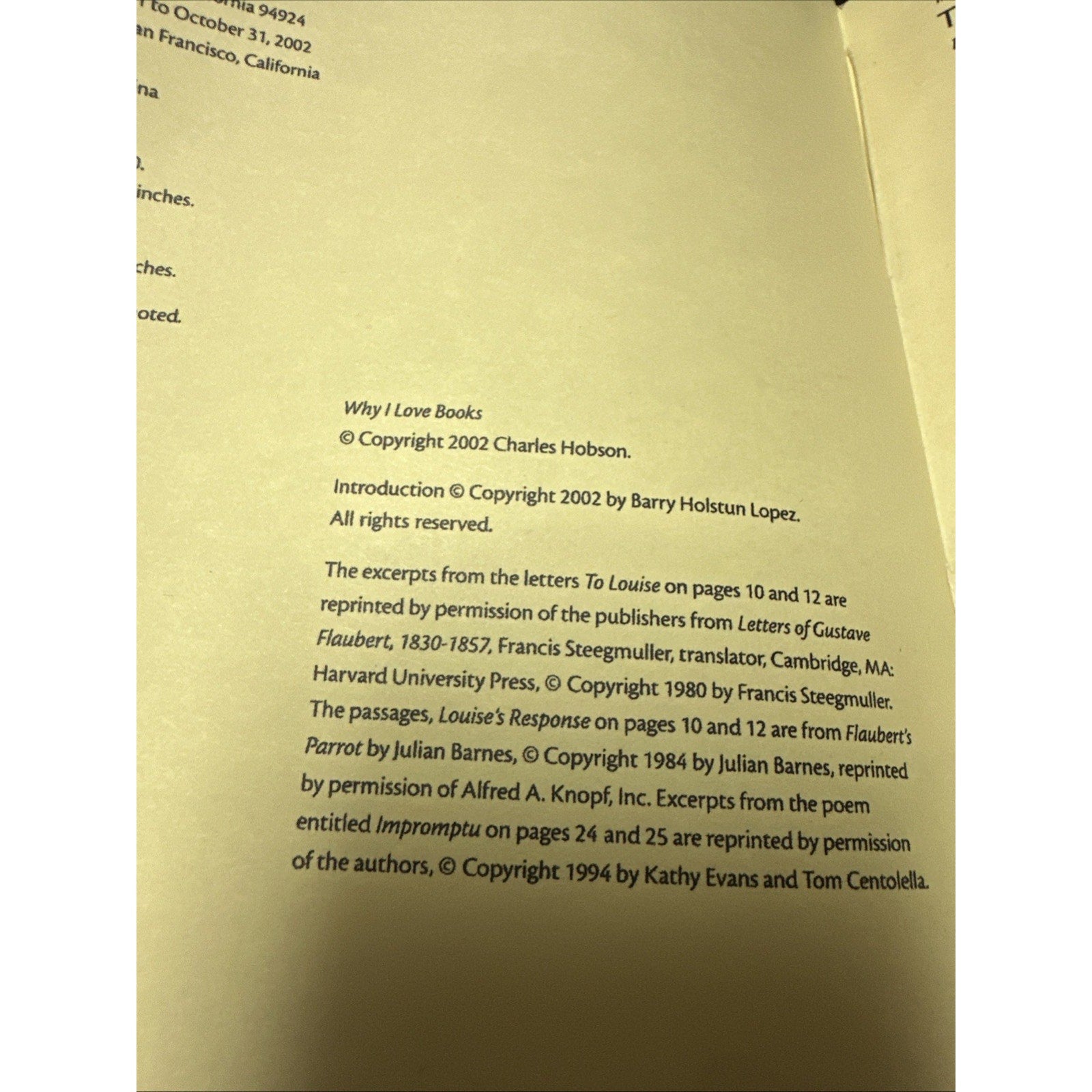 "Why I Love Books; The Artworks of Charles Hobson 2002" by author Charles Hobson. Published by the Bolinas Museum in 2002, this book focuses on fine arts and includes artworks by the artist. Written in English, this collectible item offers a unique insight into the world of art and photography through the lens of the artist's own perspective.
