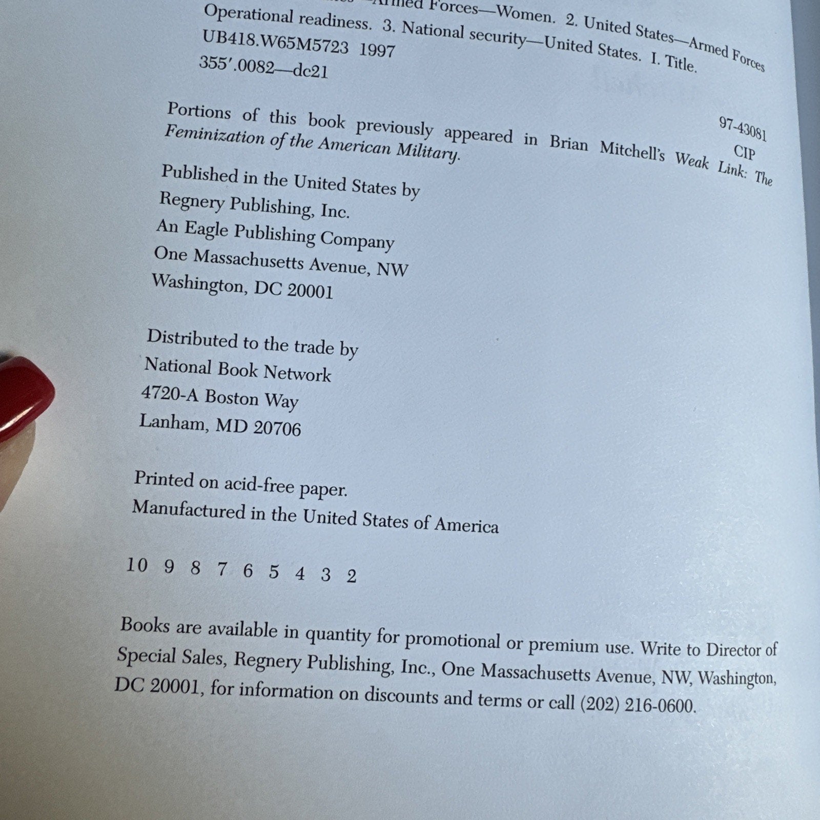 This book, "Women in the Military: Flirting with Disaster" by Brian Mitchell, is a hardcover book with a dust jacket. It was published in 1998 by Regnery Publishing and has 390 pages. The book's dimensions are 9.3 inches in length, 6.4 inches in width, and 0.5 inches in height, with a weight of 24.3 ounces. The book's topic areas include military and security (national and international), and it is intended for a general audience interested in history and political science.